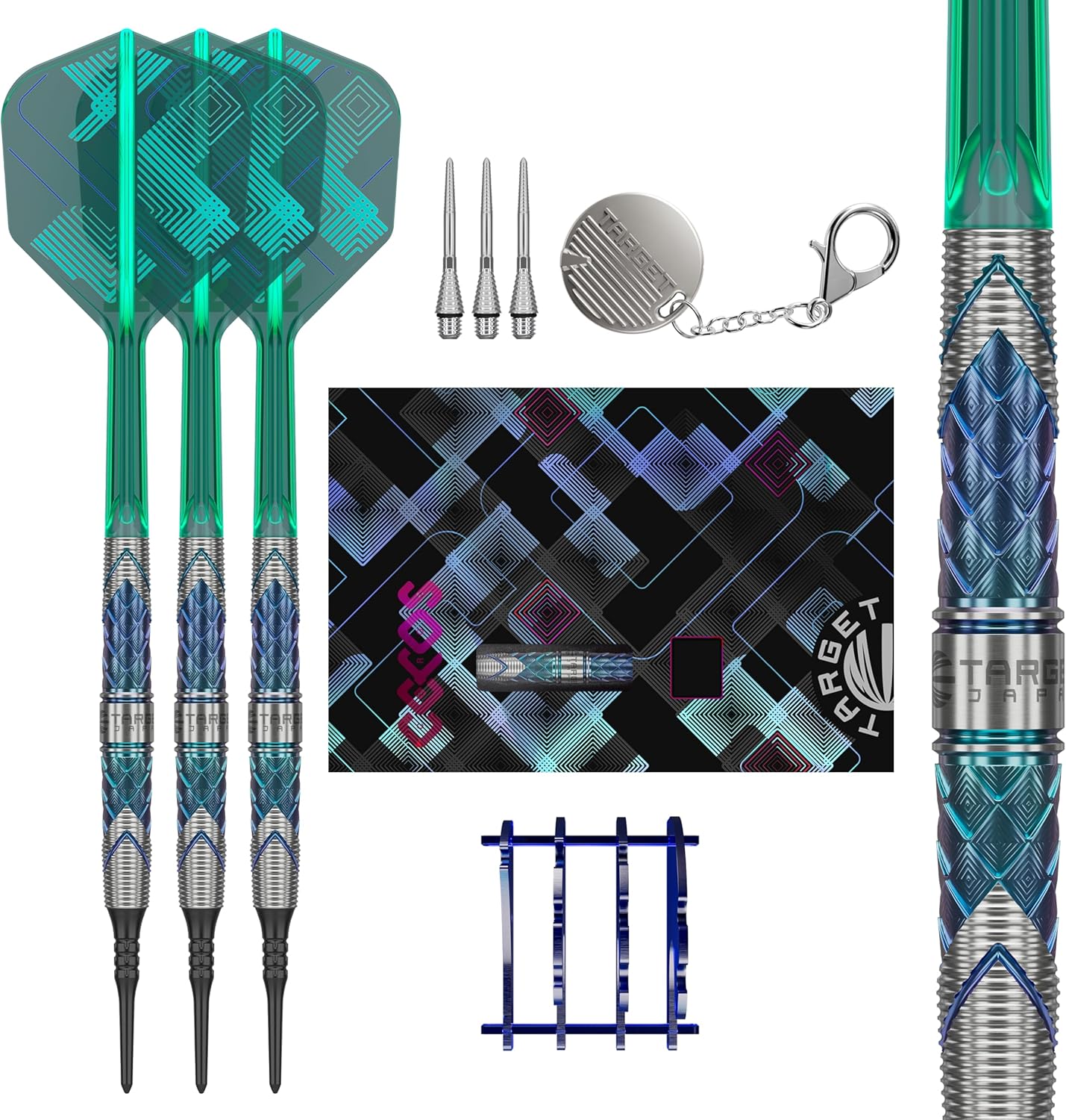 | Included Components | 3 x 90% Tungsten Barrels 3 x Black Soft Tips 3 x Grooved Swiss Titanium Conversion Tips (Silver 30mm) 3 x Green K-Flex No.6 Ceros Wings and Shafts (for Advanced 26mm) 1 x High Quality Swiss Point Keychain Tool 1 x Dart Stand 1 x Dart Storage Tin |