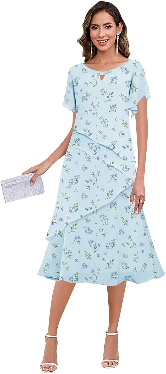 Product Features Fabric: Chiffon Design: Sequin neck,short sleeves,ruffle,chiffon fabric,tea length,zipper back Occasion: Mother of the Bride dress,Mother of the groom dress,Bridesmaid dress,Wedding guest dresses,Prom dresses,Formal Party dress,Formal Evening dresses for women,Birthday dress, Photo Shoot dresses, Formal evening party dresses, Formal party dresses, Holiday dresses, Anniversary engagement dresses,Pageant,Ceremony, Rehearsal dinners dresses, Red carpet dresses, Outdoor,Dating, and any other special occasions. Neckline: Scoop Neck Hemline:Tea Length How to choose size?If you want to make the dress fit better,please refer to these measurements as below.1.Bust _____ inch 2.Waist _____ inch 3.Hips _____ inch 4.Hollow to floor(Shoulder to Feet without heels on) ___ inch 5.Height: _____inch 6.The height of your high heel shoes: _____inch NOTES: Due to display, lighting, environment, different batches of fabrics and other reasons, there may be a slight color difference phenomenon. Hope to get your understanding!