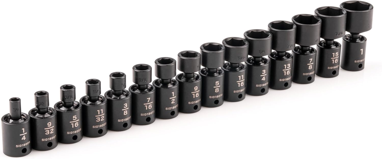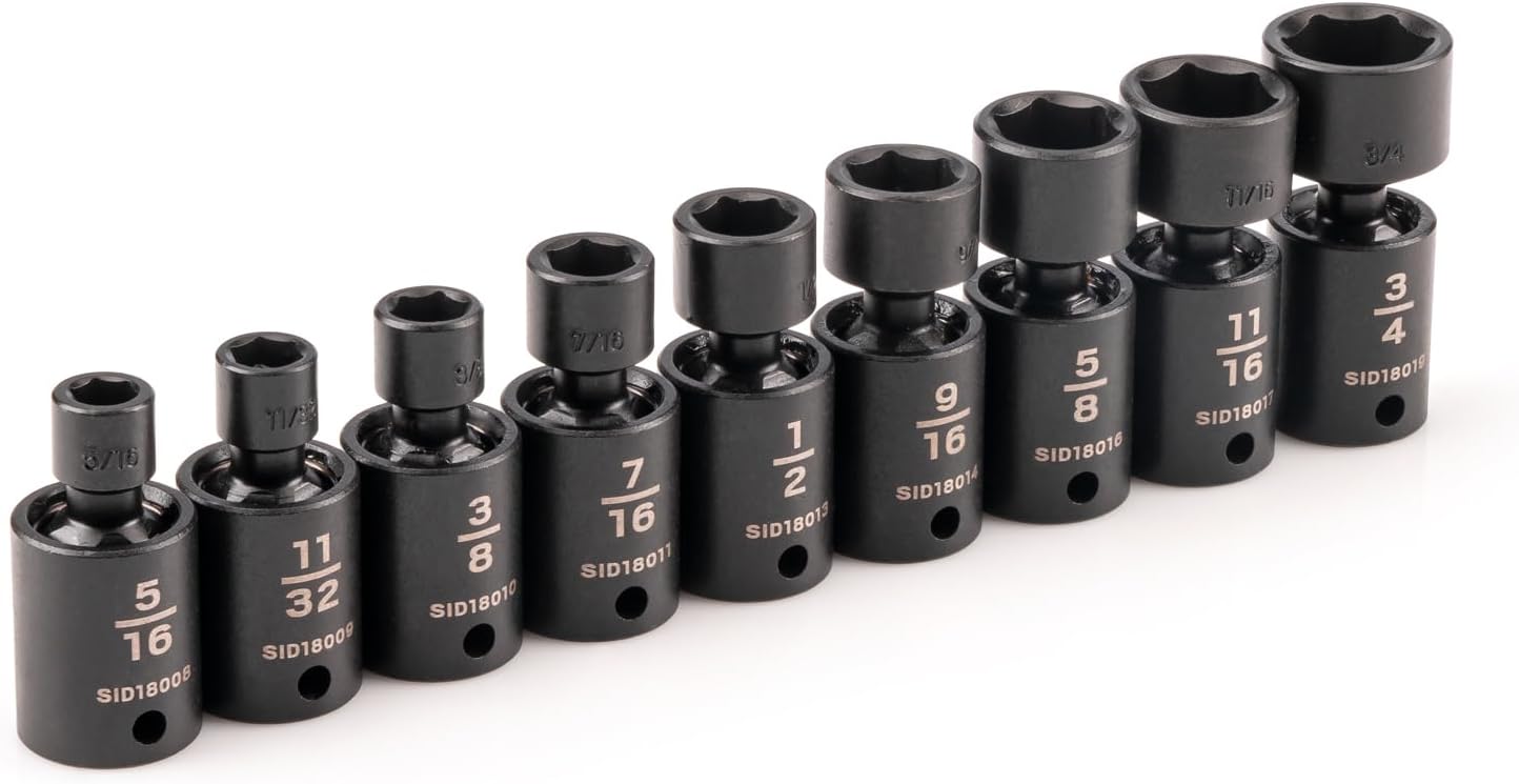 Tekton Universal Joint 6-Point Impact Sockets have a compact design for tight spaces. The joint of the socket rotates smoothly and continuously at up to a 30-degree angle. Our solid ball-and-socket style joint is stronger than joints that use pins. The 6-sided ball operates more smoothly than 4-lug designs. The socket base is made from 4140 chromium-molybdenum steel, and the ball/socket piece is made from 8660 nickel-chromium-molybdenum steel. Both pieces have a corrosion-resistant manganese phosphate coating. The socket comes pre-lubricated with SuperLube Multi-Purpose Synthetic Grease (NLGI 2) with Syncolon (PTFE). Maintain the lubrication using this grease or a comparable grease as needed to reduce wear over time. The 6-point socket opening provides an exact fit and maximum contact for hex fasteners. Radiused corners prevent fastener round-off by applying force to a fastener's flat sides, rather than its corners. The socket size is marked in two ways on every socket—both as a high-visibility laser marking and a permanent stamped marking. Smooth walls and a detent pin hole allow the socket to work with both friction ring and detent pin anvils. This set includes a socket organization rail with twist-to-lock clips that hold sockets securely and can be repositioned anywhere along the rail.