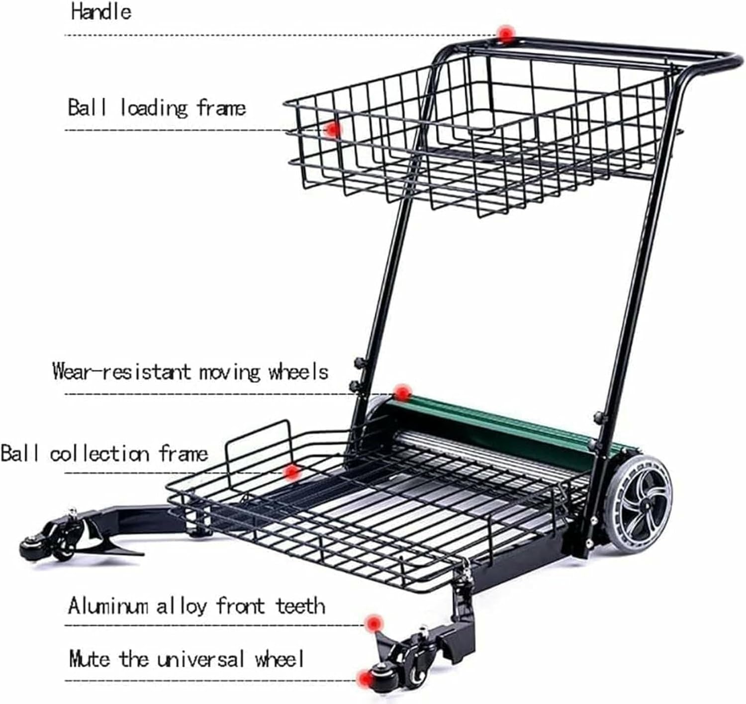 Features:1. The main body of the machine adopts an all-aluminum alloy structure to ensure long-term use and never rust2. It is non-electric, and scattered tennis balls can be easily collected by manually pushing the ball picker forward;3. Energy saving and environmental protection, high ball picking efficiency;4. One car has two uses, the bottom ball basket realizes the function of fast ball picking, and the top ball basket realizes the function of large-capacity ball loading;5. The structure is simple and compact, convenient and practical, and the shape is avant-garde;Specifications:Product Name: Tennis Automatic Ball Picker/Ball Loading CarMaterial: Aluminum Alloy, Iron Wire Dipped In PlasticBall Loading Capacity: 290Color: Orange, GreenWheels: Universal Mobile WheelsAppearance: PrimerProduct Weight: 18.5kgPackaging Weight: 19kgProduct Size: 85*85*31.5cmPackaging Size: 78*83*36cmProduct List:Tennis Ball Automatic Picker * 1