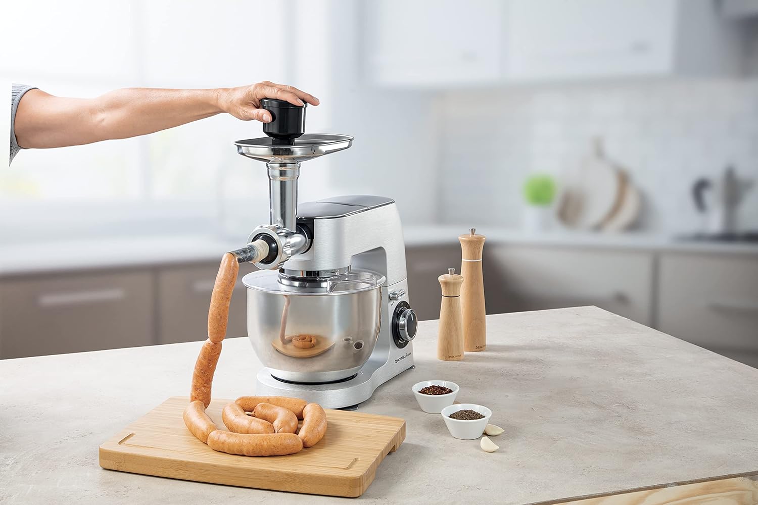 Top class all-metal stand mixer with well-balanced operation and generous equipment and accessories. Large capacity stainless steel bowl with whisk, flat beater and dough hook. Metal meat mincer with attachments for making sausages, meat rolls and cookies, drum grater for vegetables and bread with four stainless steel blades. High-performance kitchen blender with thick-glass jar. Six operating speeds, pulse function, stable attachment to worktop.