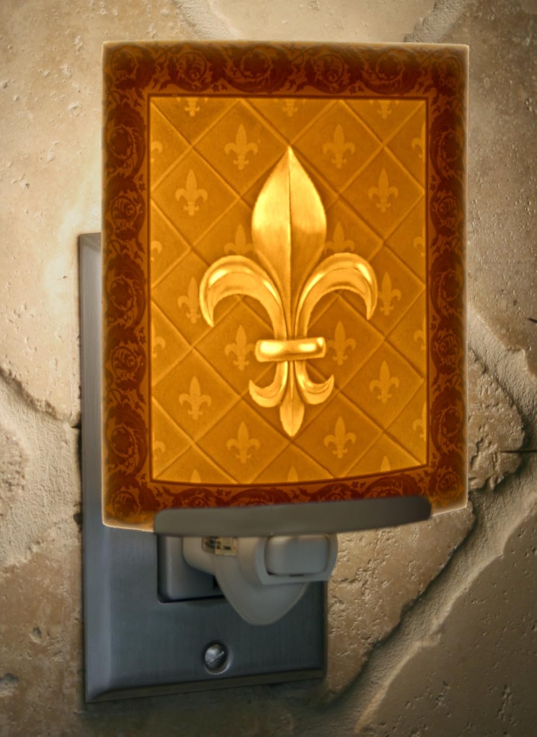 This is a "lithophane"; a thin translucent porcelain night light, made using a lost art from the 1800's. When lit from behind, the light shining through the different thicknesses of the carving causes a highly detailed image to appear in front, almost magically. As you see, the illuminated image is so detailed, that it has a totally photographic quality to it! In addition, the relief of the carving gives the image a 3 dimensional quality when seen in person. To make them, we start by carving the image in a translucent wax, with the wax lit from behind. We then take a plaster mold of this engraving, and we then cast a fine porcelain clay into this mold. We then kiln fire the porcelain to 2300 degrees F. to achieve it's translucency and durability. Lithophanes were invented in France in 1827, and were popular throughout Europe till the early 1900's. They mysteriously faded from popularity with the advent of electricity, which is ironic as they look way better with electric light than candles. We first started making them 32 years ago by reproducing the antique ones. We eventually learned how to engrave our own originals, and this has been our specialty ever since. Our lithophanes truly make for a beautiful and practical piece of art that you will use daily for year after year! The Fleur De Lis is a stylized lily design that has been used for centuries, and you see it a lot in heraldry. It can represent royalty, especially French, and has many other interesting meanings. A beautiful symbol, and a beautiful night light!