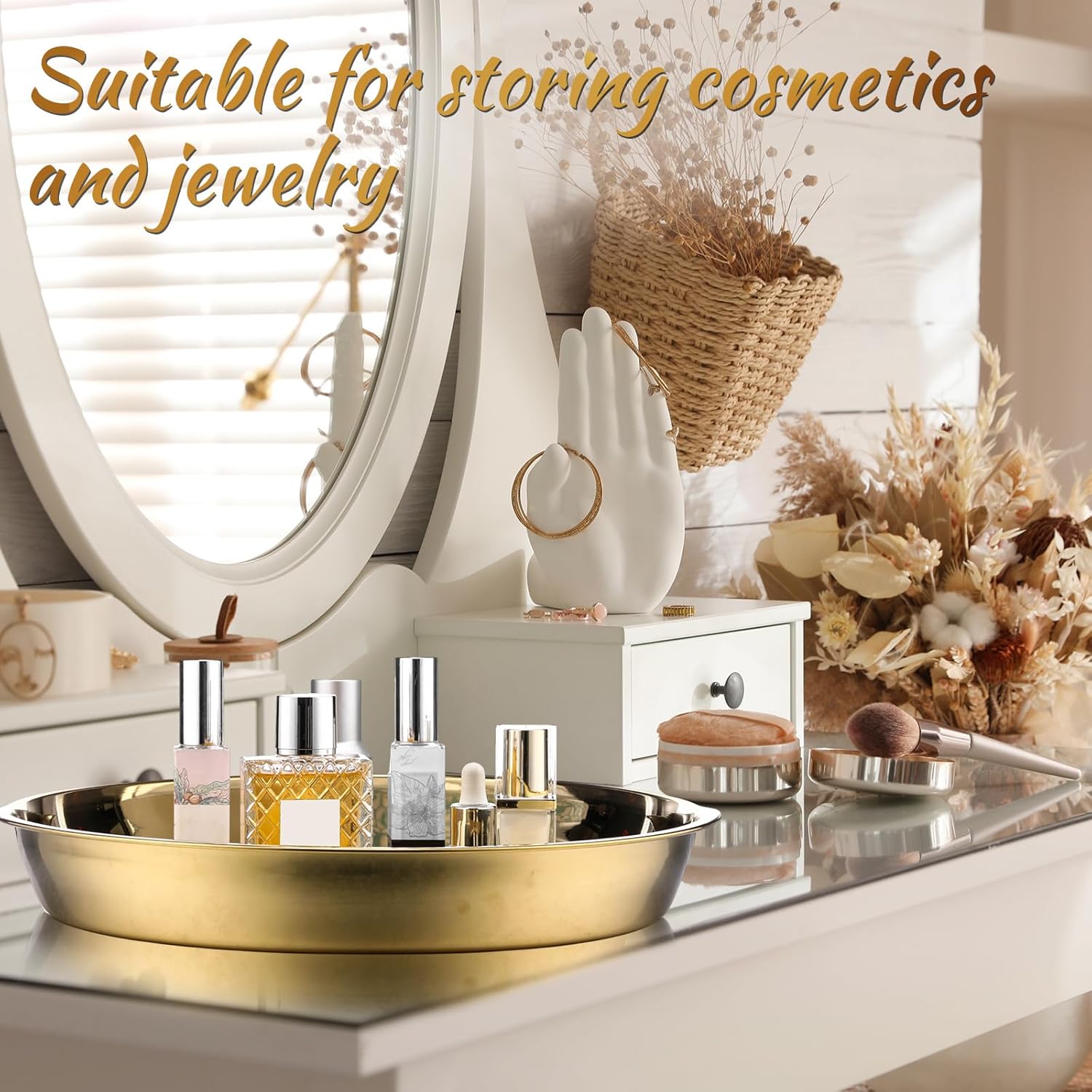 Features: Round decorative plates and trays can match well with different decoration styles at your home, can be applied at home, kitchen, bars, office, study room and so on, adding more charm to your decor. Circle tray for coffee table can be applied as jewelry tray, cosmetic storage box, coffee table service tray, key tray, candle tray, indoor flower pot, and does not take up too much space, you can keep many kinds of desktop items on round decorative tray, making your home neat and orderly. Specifications: Material: stainless steel Color: gold with brushed brass finish Size: (approx. ) Diameter: 15 inches/ 38 cm Height: 1.06 inches/ 2.7 cm Package includes: 3 x Round serving tray Notes: Manual measurement, please allow slight errors on size. The color may exist a slight difference due to different screen displays.