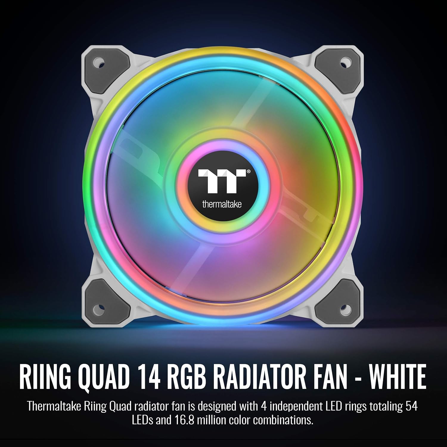 Thermaltake Riing Quad RGB is the first 4-ring design radiator fan with 54 LEDs all at the front side, supporting NeonMaker light editing Software and TT RGB PLUS. The fan itself utilizes a PWM controlled high-static pressure fan, long-life hydraulic bearing and compression fan blade design, delivering remarkable cooling performance without sacrificing quiet operation. P/N: CL-F088-PL12SW-BFAN DIMENSION: 120 x 120 x 25 mmINTERFACE: USB 2.0 connectors (9 Pin)SYSTEM COMPATIBILITY: Windows 7 / 8 / 8.1 / 10FAN STARTED VOLTAGE: 9.0 VFAN RATED VOLTAGE: 12 V & 5VRATED CURRENT: 12V- 0.09 A , 5v – 0.9A (Fan*1)POWER INPUT: 12V – 3.24 W . 5V – 13.5 W (Fan*3)FAN SPEED: 500 ~ 1500 R.P.MMAX. AIR PRESSURE: 1.4 mm-H2MAX AIR FLOW: 40.9 CFMNOISE: 25 dB-ABEARING TYPE: Hydraulic BearingLIFE EXPECTATION: 40,000 hrs,25℃WEIGHT: 189 g (Fan*1).