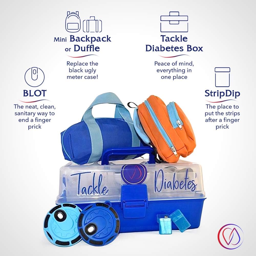 ThisDiabetic organizer starter kit - tackle diabetes in a fun and functional wayThisDiabetic accessories are specially designed by a TD1 for fellow diabetics. Because we're all about empowerment, ease of use and peace of mind.What are included in the Tackle Diabetes starter kit 1. Tackle Diabetes organizer box: enjoy peace of mind and everything in one place. Emergencies happen when you live with diabetes, so be prepared. This Tackle Diabetes storage organizer box is specially designed to hold all diabetic needs, such as pumps, pods, replacement equipment, emergency equipment, vials, needles, infusion sets, continuous glucose monitor, snacks and others. It comes with an emergency Diabetic Safety Sheet that contains all important information and what to do in situations that arise when caring for someone with TD1. 2. BLOT: no more licking! Or dirty tissues! Or stinging alcohol wipes! The neat, clean, sanitary way to end a finger prick. You can press on the white cotton to blot your finger before rotating it to a clean cotton spot. The innovative diabetic finger blotter may collect 12-18 blots before replacement of a standard cotton round is required. Video on the BLOT product page. 3. Mini backpack OR duffle bag: holds all daily diabetic supplies in a fun and functional way and then some. Backpack comes with 3 elastic interior mesh pouches, 1 interior zipper pouch and 1 exterior zipper pouch. Duffle comes with 5 elastic mesh pouches and 1 zipper pouch (replace that ugly-looking meter case now!) 4. StripDip: tame those strips that get everywhere with this - a nifty case to put glucose strips after every finger prick.