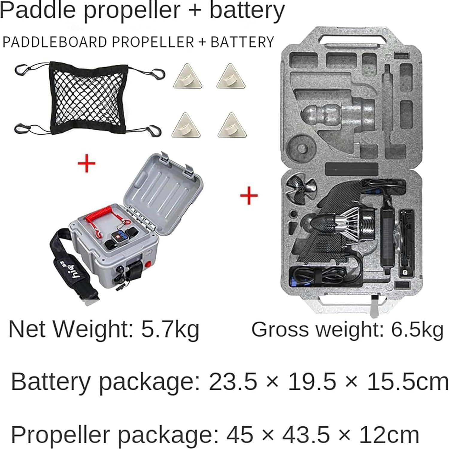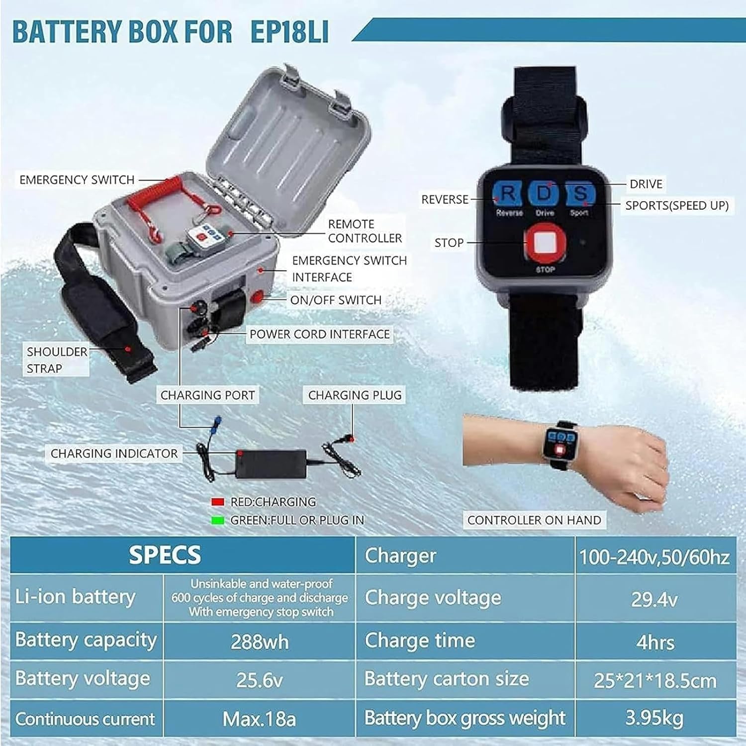 Features:This electric fin comes with a remote control watch, waterproof and unsinkable, remote control distance up to 5 meters. The remote control watch is divided into 3 gears: low speed (D), high speed (S), and reverse (R), allowing you to easily control accurate speed and direction. Specification: Electric propulsion parameters: Motor power: 160W Speed: 3-6 km/h Battery life: 2-3 s The longest cruising range: 20KM Packing volume: 450X435X120MM Occasion: Offshore waters Gross weight: 2KG Battery parameters: Net weight/gross weight: 3.7KG/3.86KG Waterproof grade: IP7 Voltage: 24V Capacity: 288 Wh Charging current: Continuous working current: 10A/1.2H Working temperature: 045℃ Packing volume: 235X195X155MM Package includes: 1X Thruster 1 charger