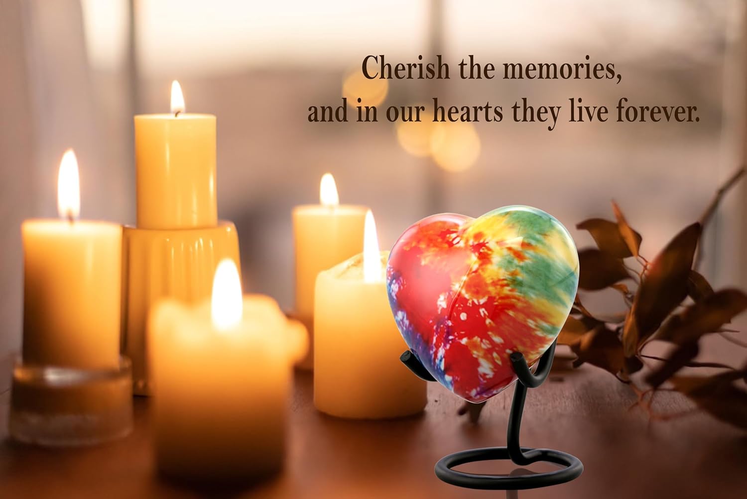 The Tie Dye Heart Urn for Human Ashes by Silent Goodbyes is the most vibrant and elegant way to pay tribute to the memory of your loved one. The handcrafted heart urn with a unique tie-dye design is made from durable metal with a polished finish. Compact and versatile, this small cremation urn will hold up to 3 cubic inches of ashes, making it the perfect one for sharing ashes of women, men, babies, or pets. It comes with a display stand, a velvet case, and bag. It is a meaningful colorful keepsake urn that is used for memorials or home decor. This is a beautiful tribute that includes quality.