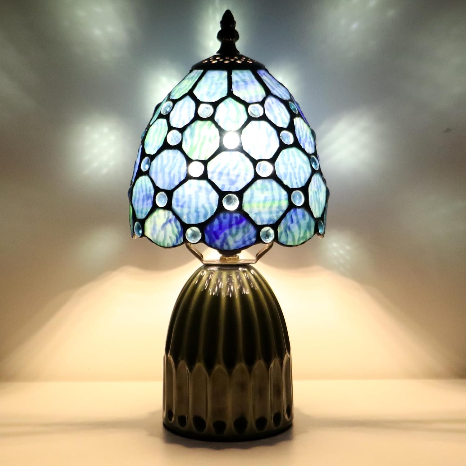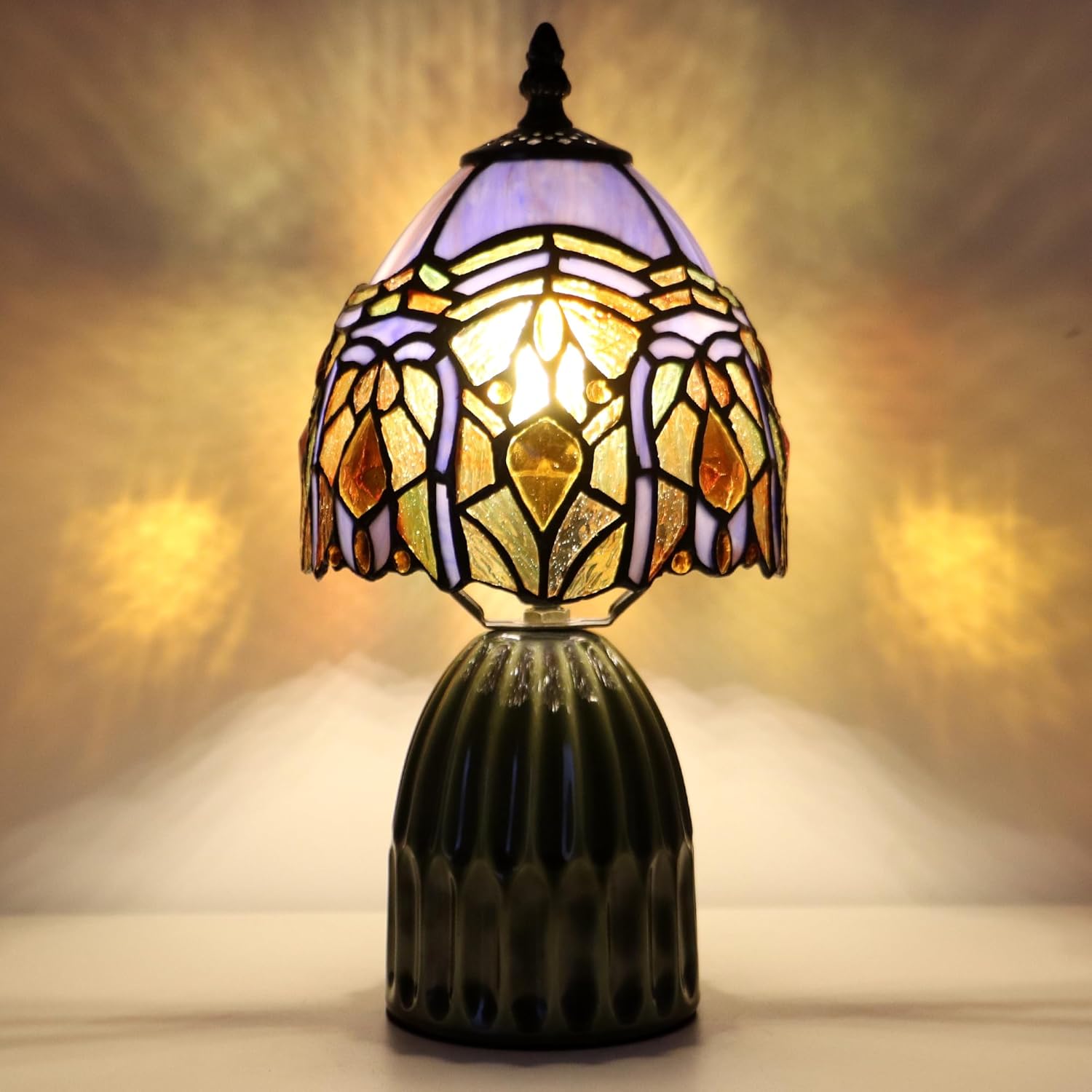 • Base and lampshade material: temperature ceramic glaze base, high-end appearance, the whole is very strong; The lampshade is colored glass, which is hand-made by copper groove wrapping and welding.