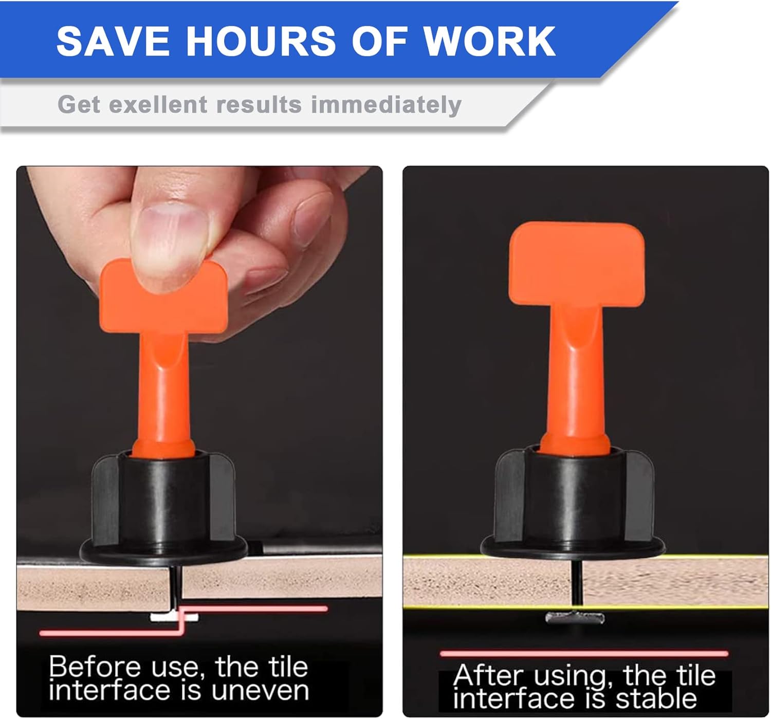 We use a non-replaceable T-pin design in our tile leveling system, it will not shake, more reliable to maintain the level, and the T-pin is designed with a rounded head, which is less likely to damage the tiles.【Specification】Material: PP and Stainless SteelColor: Black and OrangeSuitable Spacer: 1.5~7mmSuitable for Tile thickness: 5~16mm【Package Includes】1/16" tile levelers x 250pcs1/12" tile spacers x 500pcsspecial wrenches x 5pcs【Note】This product contains small parts, to avoid misuse, please place it out of reach of children.Please remove the leveler before the cement or tile adhesive is completely dry.We value our customers' experience, if you have any questions, please contact us, we never stop improving our products.