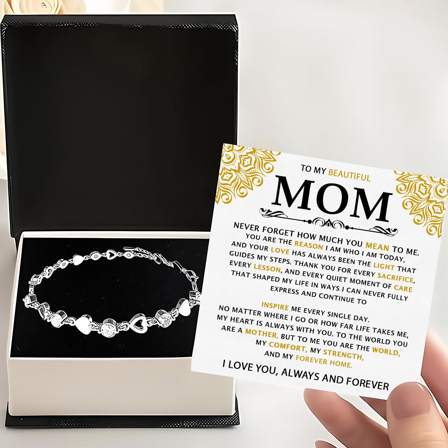 💖💖Are you searching for a gift as meaningful and elegant as the woman you cherish? Our Heart Link Bracelet is the perfect choice. Featuring delicate heart-shaped links and shimmering cubic zirconia stones, this exquisite piece captures the essence of love, appreciation, and timeless beauty. Ideal for birthdays, anniversaries, holidays, or simply to say “you’re cherished,” this bracelet is more than an accessory—it’s a radiant reminder of how much she means to you. 💖💖Our Heart Link Bracelet is crafted with 14k white gold over durable stainless steel and accented with high-quality cubic zirconia, offering brilliance and long-lasting shine. With its adjustable length of 17–21 cm, this bracelet provides a comfortable and secure fit for most wrists. 💖💖Designed with care and attention to detail, this bracelet adds a touch of sparkle to any outfit—whether worn daily or on special occasions. Its lightweight feel and elegant silhouette make it an effortless addition to her jewelry collection and a piece she’ll treasure forever. 💖💖Watch her eyes light up with joy and gratitude as she opens this beautiful gift. Presented in a complimentary soft-touch gift box—with options to upgrade to a mahogany-style LED box or Christmas Green Box—it creates a truly memorable unboxing moment. 💖💖EXCELLENT CUSTOMER SERVICE: We are committed to providing exceptional customer service and a 100% satisfaction shopping experience. If you are not completely satisfied with your purchase, simply contact us and we will resolve your issue within 24 hours.