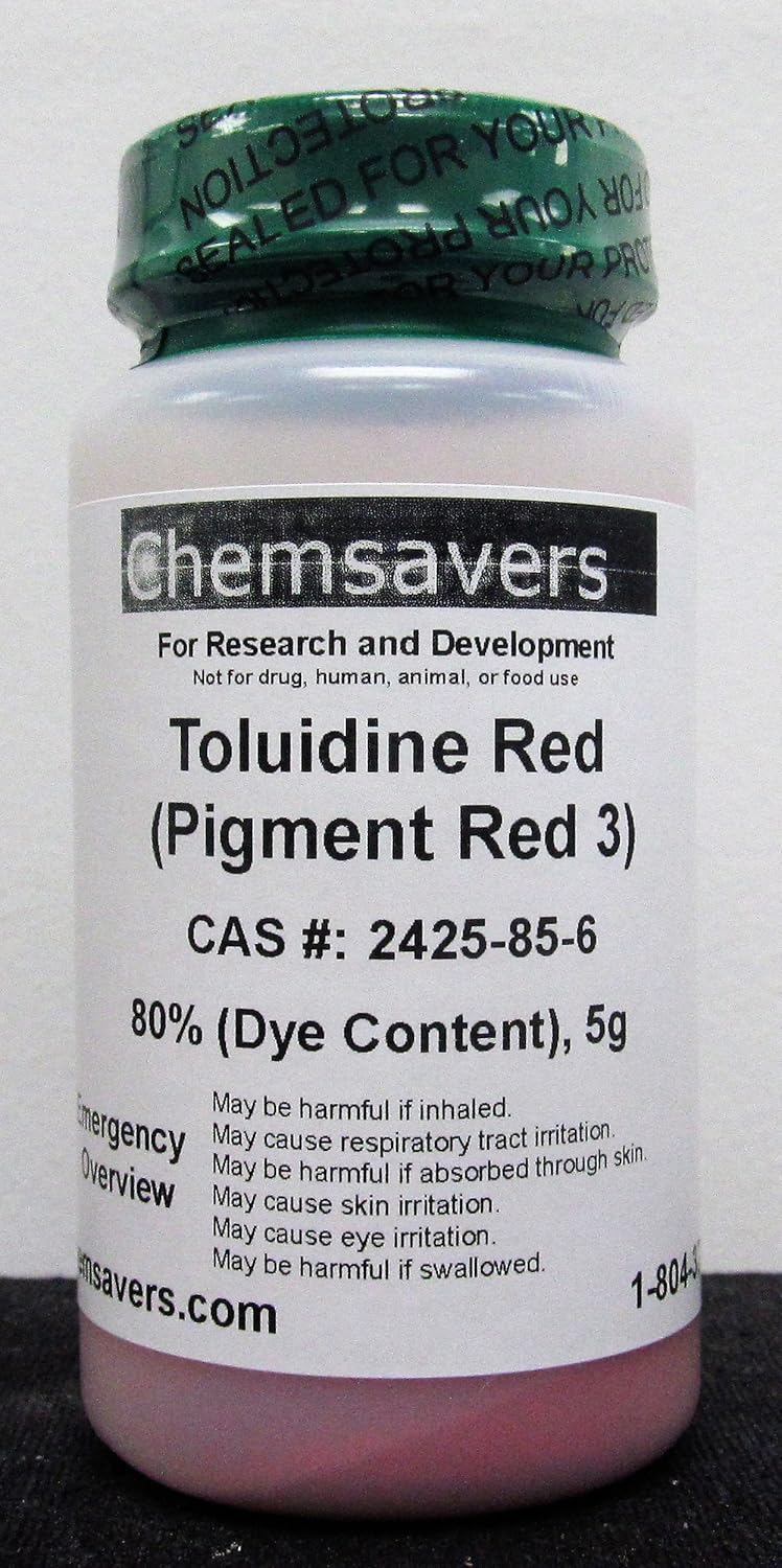 Toluidine Red (Pigment Red 3), 80% (Dye Content), 5g For Research & Development Not for drug, human, animal, or food use Certificate of Analysis: Appearance (Color) Red Appearance (Form) Powder Assay (Dye Content) 80% Infrared Spectrum Conforms to structure Carbon ≥46.5% Nitrogen ≥9.6% Wavelength 503 - 513 nm Extinction Coefficient ≥15000 Wavelength 395 - 405 nm Extinction Coefficient ≥6000 Wavelength 295 - 305 nm Extinction Coefficient ≥7000 In Toluene CAS: 2425-85-6 FORMULA: C17H13N3O3