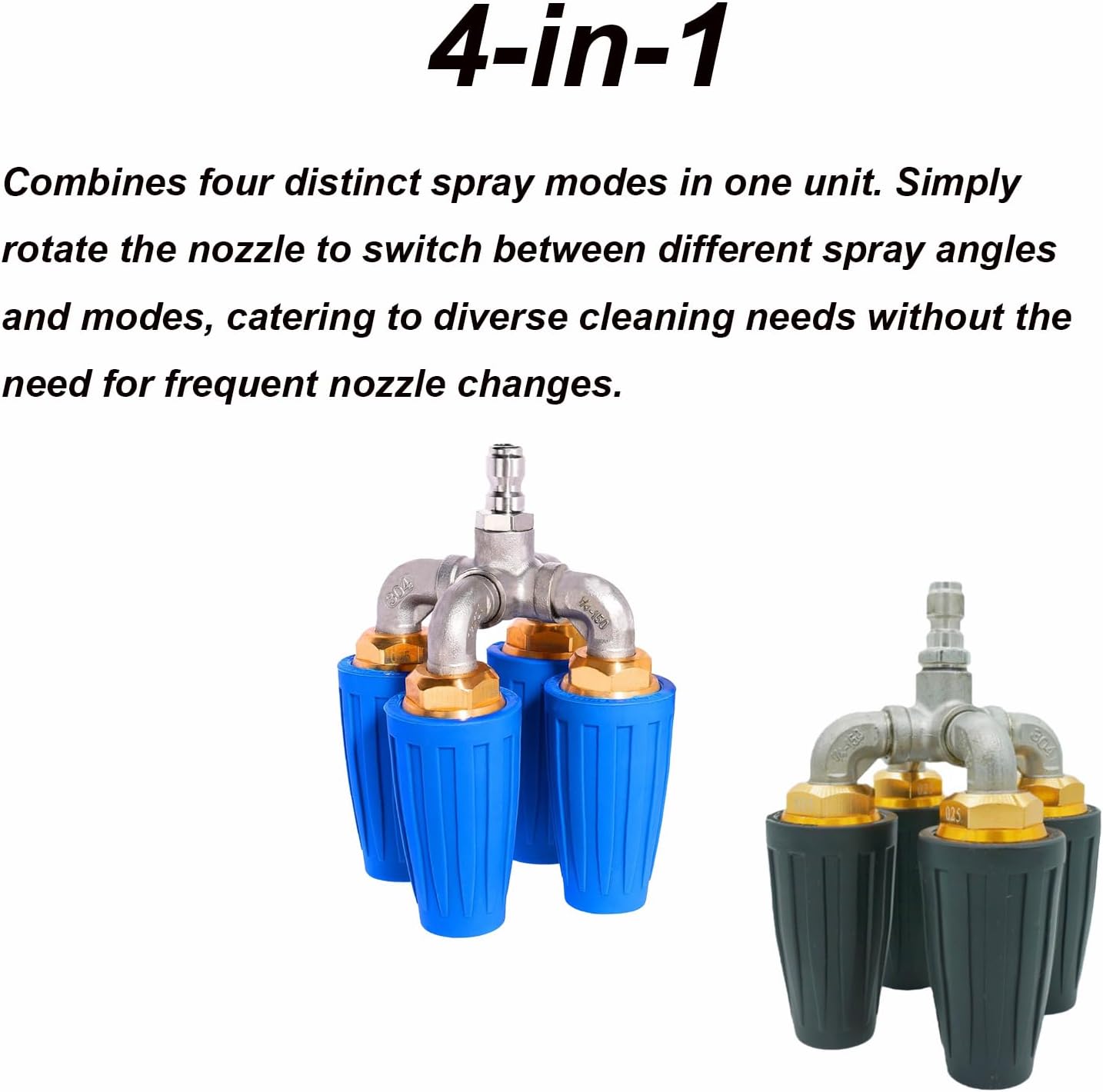 Feature:【Superior Materials】The four-in-one turbine nozzle is crafted from high-grade aluminium alloy, offering high-pressure resistance and corrosion-proof properties to ensure long-term, wear-free operation in harsh environments.【4- in-1】This nozzle integrates four distinct spray patterns. Rotate the nozzle to switch between different spray angles and modes, meeting diverse cleaning requirements without frequent nozzle changes.【High-Efficiency Cleaning】The four-in-one turbine nozzle design enhances water flow, expanding cleaning coverage. Featuring a 360° rotating nozzle, it efficiently handles large areas, significantly boosting cleaning efficiency and reducing task duration.【1/4" Quick-Connect】The quad-turbo nozzle high-pressure washer features a universal 1/4-inch quick-connect fitting for effortless attachment to various high-pressure cleaning tools and spray lances.【Versatile Application】The 360° rotating turbo nozzle withstands pressures up to 4000 PSI, ensuring efficient and reliable cleaning performance across diverse cleaning scenarios.Specification:Name: 4-in-1 Turbo Nozzle Pressure Washer with GlovesMaterial: Aluminum AlloyConnect Size: 1/4inColour: BlackPackage Included:1 * 4-in-1 Turbo Nozzle Pressure Washer with Gloves