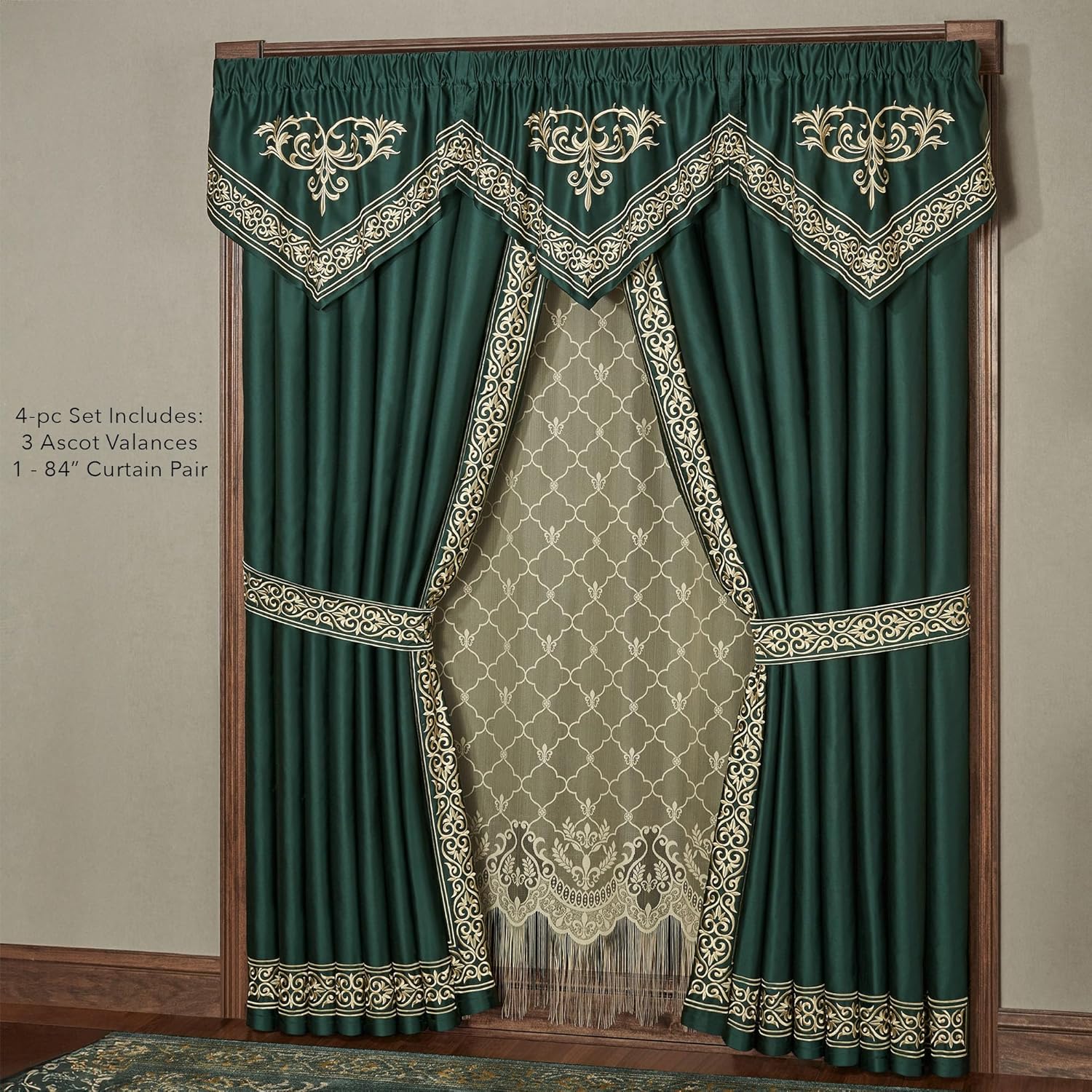 Transform your boudoir into that of an exquisite palace with the lovely Balmoral Window Treatments and its beautiful traditional style. In beautiful polyester sateen, the emerald green ensemble features grandly embroidered golden scrolling filigree and defining band trim for elegant definition along each tailored bottom edge while adding a touch of luxury. Each lined window accent hangs via 3" rod pockets and your decorative curtain rod, creating a beautifully coordinated look adding elegance and sophistication to your home. Window drapery set includes three ascot valances and one curtain pair. Ascot valances also feature an embroidered swag accent. Curtain Pair also has embroidered framing designs on the inside edge; tiebacks are included. Ascot Valances measure 32"Wx22"L each. Curtain Pair measures 84"Wx84"L overall. For best results, dry clean. Imported.