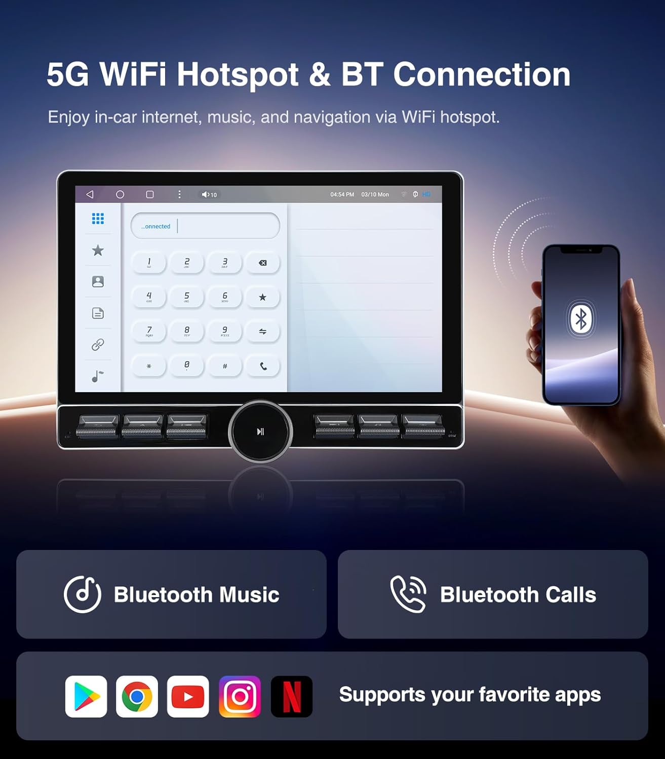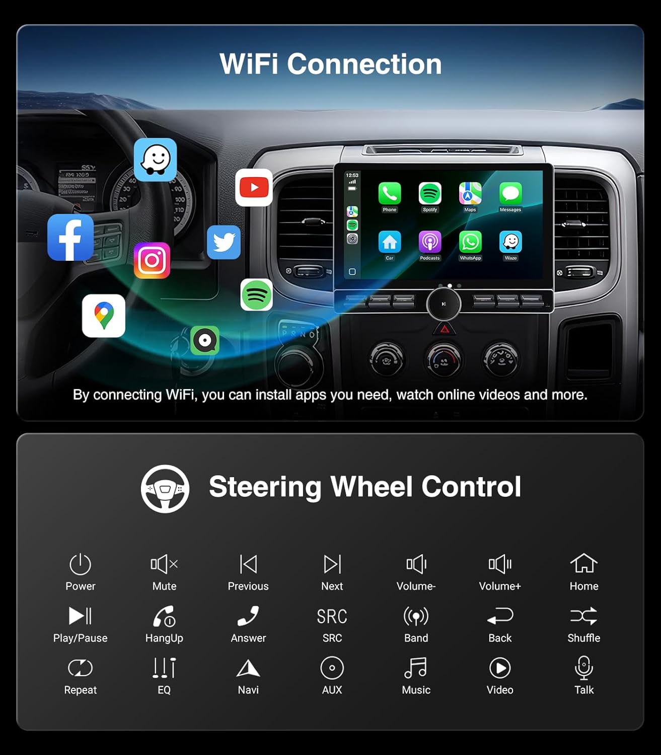 | Additional Features | 13.1 inch 1920x1200 Resolution Touch Screen, 6G Ram+128G Rom, Built-In Wi-Fi, Bluetooth, FM+AUX,, Touchscreen, RDS, USB 4Pin, Highest Level QLED, Split Screen Function, Equalizer, Siri Voice Control, Volume Control, Bluetooth Hands-Free Calling, Music Streaming, RCA, Subwoofer, Spotify, Rear View Camera Input, Support original backup camera, Wireless/Wire(Carplay&Android Auto), Android Mirroring+Airplay |
