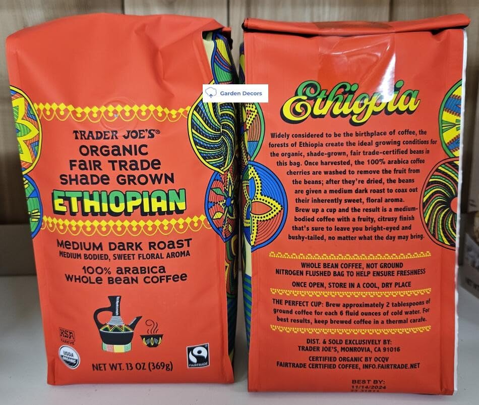 Trader Joe's Organic Fair Trade Shade Grown Ethiopian Medium Dark Roast Whole Bean Coffee 13oz 369g (Two Bags)