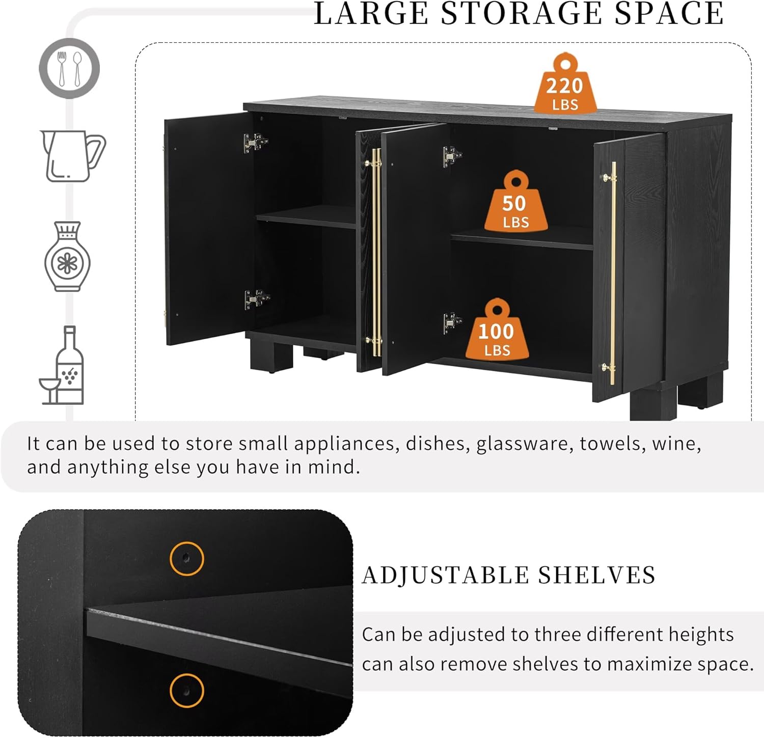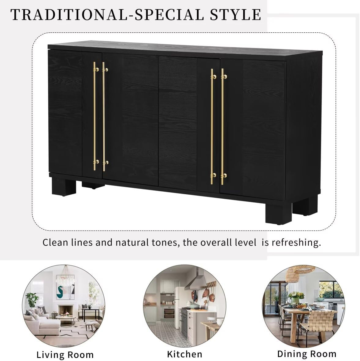 Traditional Style 60" Buffet Sideboard Cabinet with Adjustable Shelves,Wood Buffet Table Cabinet with Gold Handles and Solid Wood Leg for Kitchen, Dining Room and Living Room (Black)