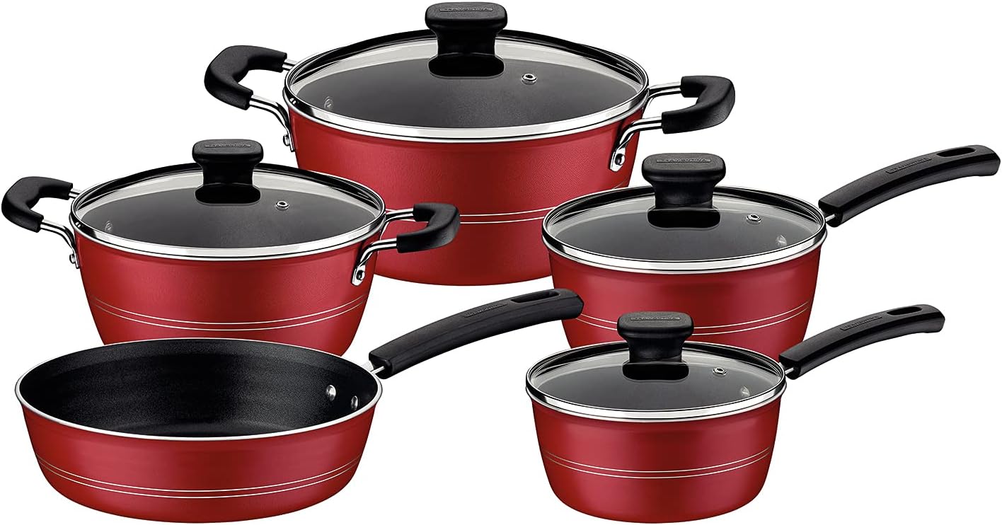 Tramontina’s Sicilia 10 Pc Aluminum Nonstick Cookware Set has everything you need to sauté hot liquids, reheat soups, deep fry chicken, and create virtually endless meals. The even gauge construction and heavy-gauge aluminum exterior of each piece means you’ll have this 10 piece cookware set in your kitchen for years to come. The Starflon Excellent nonstick interior finish is Tramontina’s proprietary nonstick system, which makes clean up less stressful. The matching heat and shatter resistant tempered glass lids have a vent hole and stainless steel rim, allowing you to watch the process of your meal while it’s cooking. The handles are Sicilia style stamped shank with over molded Bakelite, which means this cookware set is not for oven use. The entire 10 Pc set is made in Brazil and available in several colors.