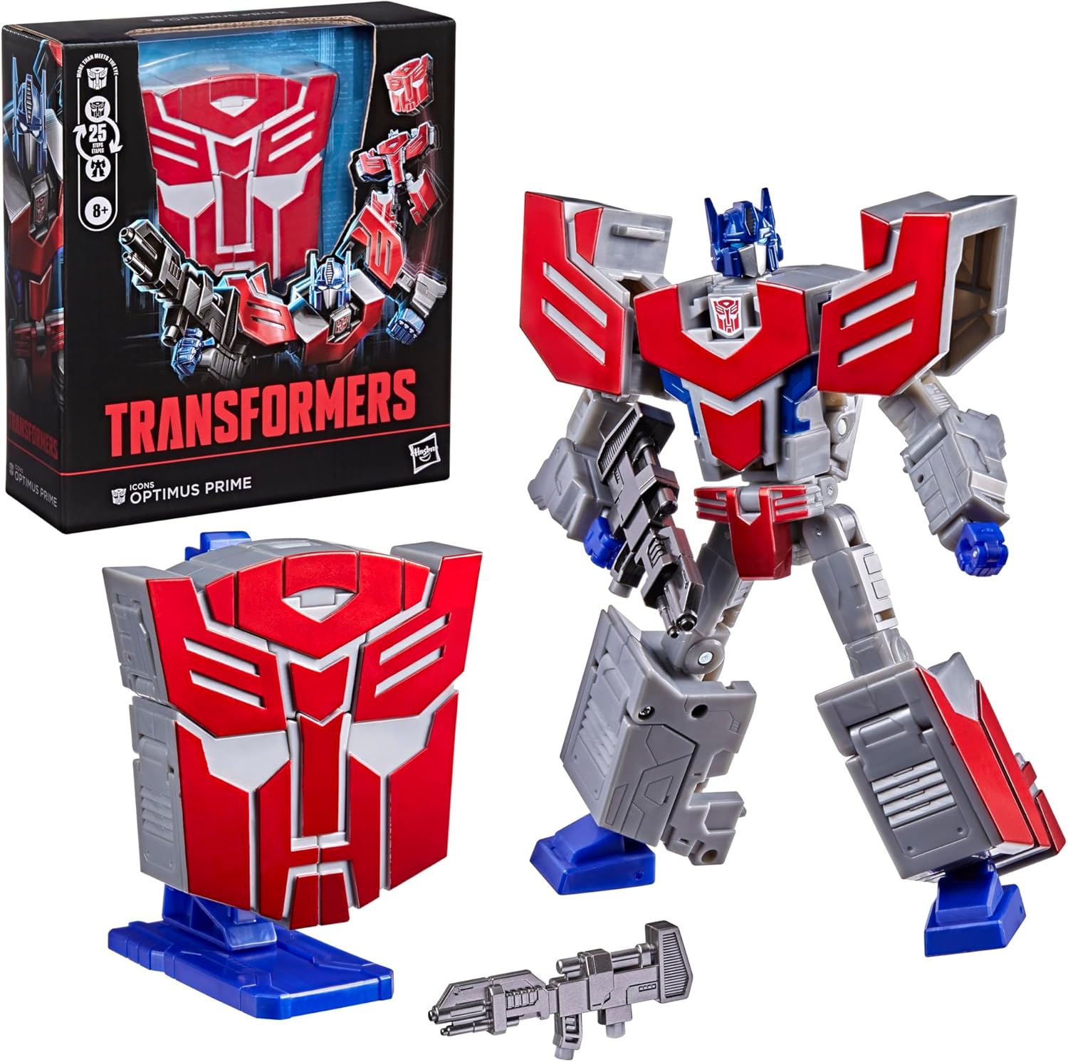 Display your faction allegiance with the Icons Optimus Prime collectible figure! The 6.75-inch (17 cm) figure converts between robot action figure and Autobot faction symbol in 25 steps. It includes a display stand for logo mode as well as a blaster accessory for epic posing in robot mode. With intricate poseability and deco and details inspired by the Transformers universe, this unique Optimus Prime Transformers figure makes an awesome addition to any collection. Look for more Transformers collectible toys (sold separately, subject to availability) featuring favorite characters like Bumblebee, Megatron, and more to create a lineup that is — More Than Meets the Eye. TRANSFORMERS and HASBRO and all related trademarks and logos are trademarks of Hasbro, Inc.