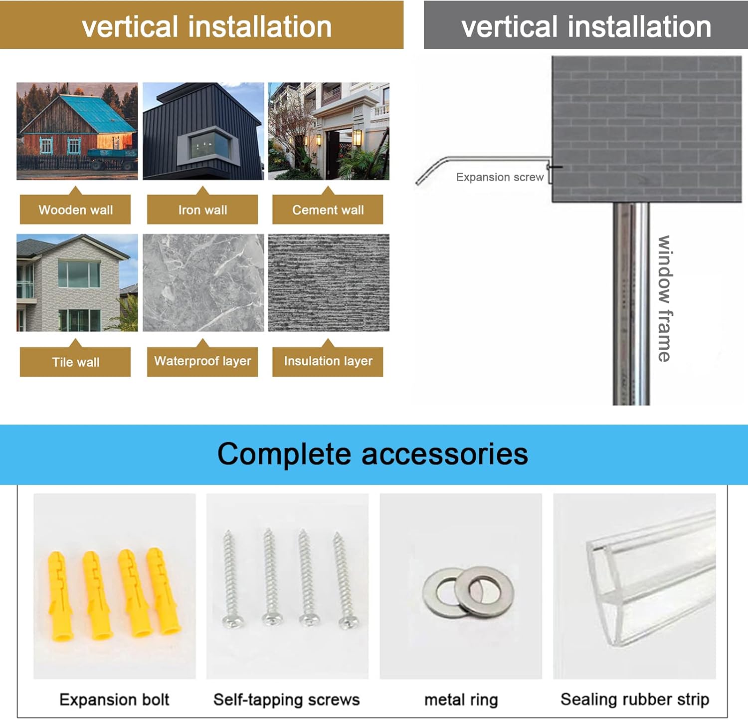 Crafted from high-quality polycarbonate, our canopy boasts exceptional impact resistance, load-bearing capacity, and flame retardant properties. With a thickness of 3.5mm (0.14 inches) and a remarkable weight capacity of 100KG (220 lbs), it is built to withstand various weather conditions, making it a durable choice for your home. Our Invisible Front Door Canopy is designed for versatility, available in 110 sizes with customization options to meet your specific needs. You can easily link multiple canopies together for expanded coverage, ensuring your home is fully protected from rain and snow. Installation is straightforward with our vertical mounting method, and it is suitable for a wide temperature range, from -40°C to 218°C. Each package includes everything you need for installation: the canopy, expansion bolts, self-tapping screws, metal washers, and sealing strips. Before you order, please measure your door or window to determine the best size and combination for your space. Remember to check all fittings and connections periodically to ensure everything remains secure.