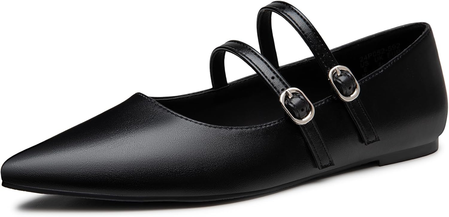Trary Flats for Women Closed Pointed Toe Mary Jane Shoes Women Comfortable Slip on Ballet Flats Dressy Shoes Adjustable Strap PU Leather Mary Janes Loafers