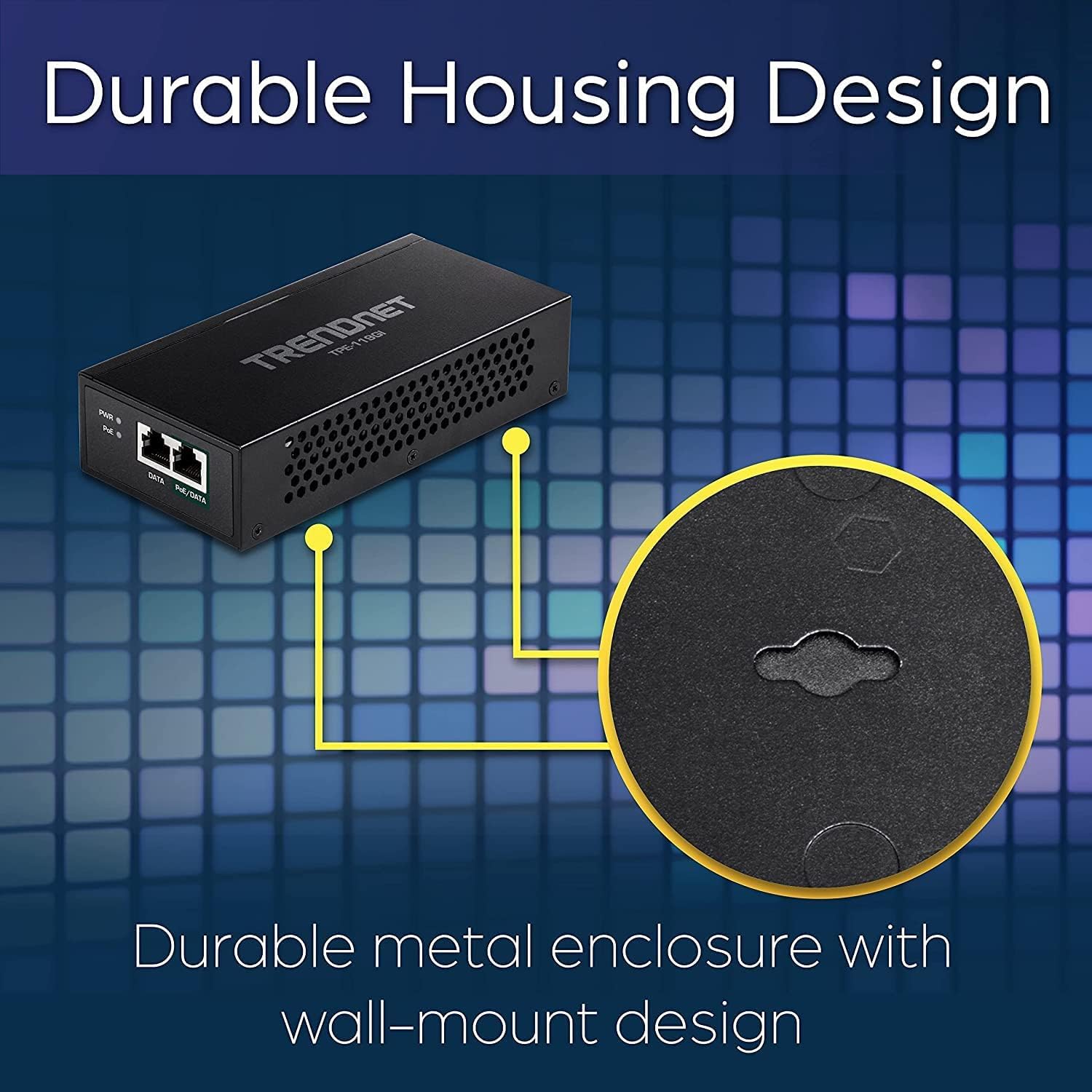 TRENDnet's Gigabit PoE++ Injector, model TPE-119GI, is an 802.3bt PoE injector that combines electrical power with a gigabit network connection to produce a high-powered 95W PoE++ network signal. Auto-sensing technology conveniently delivers the correct wattage needed to power your PoE, PoE+, and PoE++ devices. Connect the Gigabit PoE++ injector to a non-PoE switch, and then run an Ethernet cable with data + power to network a PoE device up to 100 meters (328 ft.) away. Network PoE devices such as wireless access points, IP cameras, VoIP phone systems, IPTV decoders, access controls, and more with this 802.3btbt PoE injector.4-Pair PoESupplies power to a PoE (up to 15.4W), PoE+(up to 30W), or PoE++ (up to 95W) device.Gigabit PortsThe PoE++ injector features 1 x gigabit portand 1 x gigabit PoE++ port.Wall Mount DesignWall-mount design and a sturdy metalenclosure accommodates most installationsscenarios.Package Contents• TPE-119GI• Quick Installation Guide• Power cord