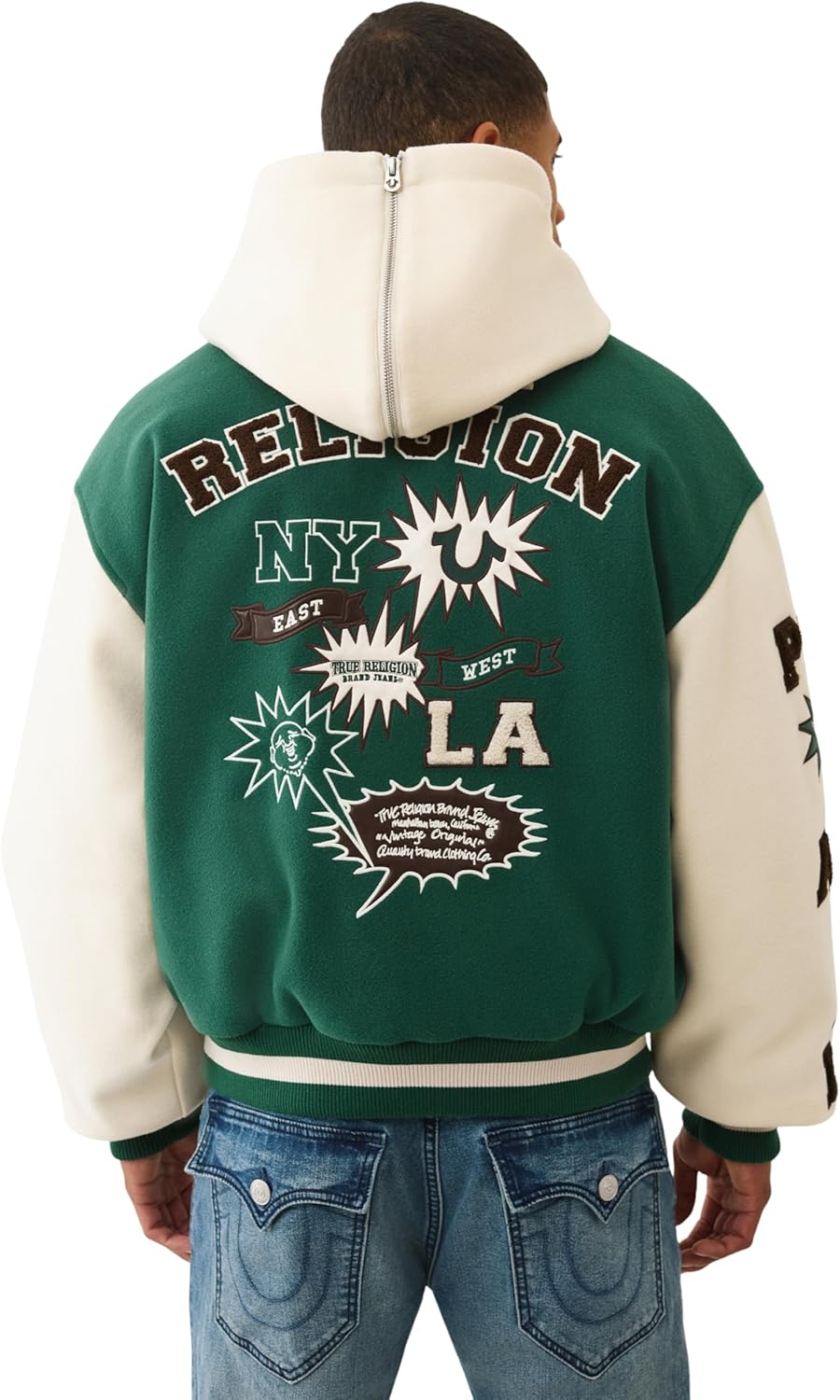 True Religion Men's Retro Wool Varsity Jacket. Crafted with a premium wool-blend body and contrasting sleeves, this classic letterman jacket features bold logo patches, striped ribbed trim, and a snap-button front. The relaxed fit and fully lined interior make it perfect for layering, offering both warmth and iconic True Religion attitude. A standout piece for transitional weather and statement streetwear looks.Attributes: Brand: True Religion Style: Retro Wool Varsity Jacket Fit: Regular/relaxed fit Closure: Snap-button front Lining: Fully lined interior Trim: Striped ribbed cuffs, collar, and hem Details: Embroidered and appliqué logo patches Pockets: Two front welt pockets Care Instructions: Dry clean only
