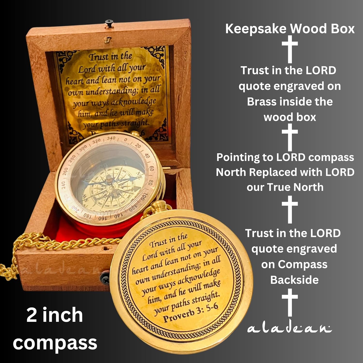 | Additional Features | Compass comes in a Handmade Wood Keep Sake Gift Box with a Small Greeting Card, Trust In The Lord With All Your Heart Quote Engraved on Compass & Wood Box |