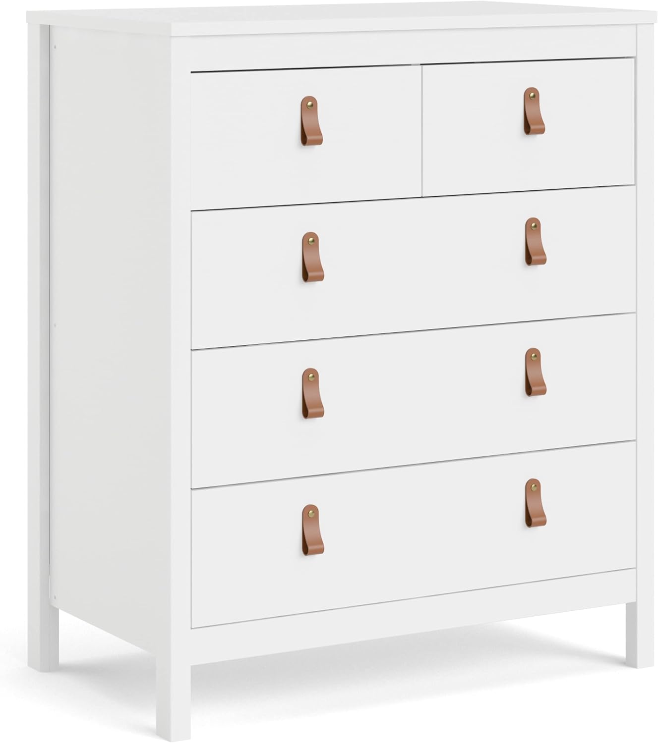 Enhance your bedroom or small space with the Madrid 5 Drawer Chest. It features a unique modern-traditional design that’s ideal for bedroom storage. The drawers are backed with metal drawer glides and comes with two types of handles-grey knobs and brown leather handles-to customize the look. The Madrid Chest has a durable foil surface that is easy to clean. Combine with other pieces from the Madrid collection to complete your bedroom space.