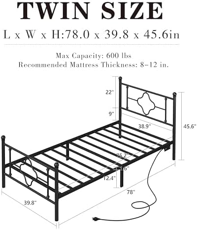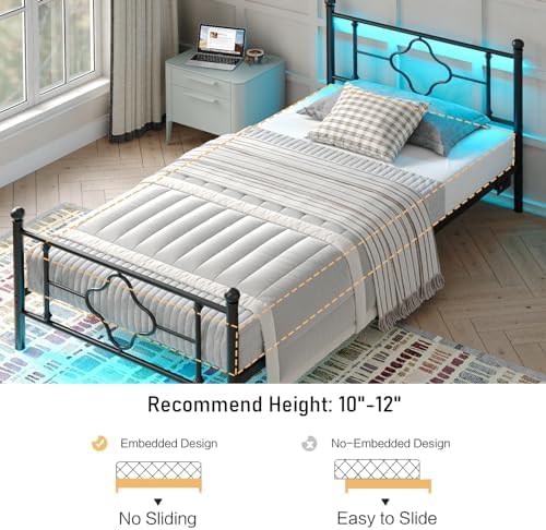 Bed Frame with Headboard and Footboard,Heavy Duty Steel Slats Support Metal Bed Frame with Charging Station