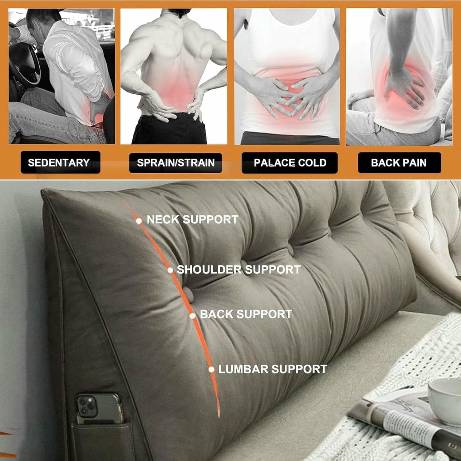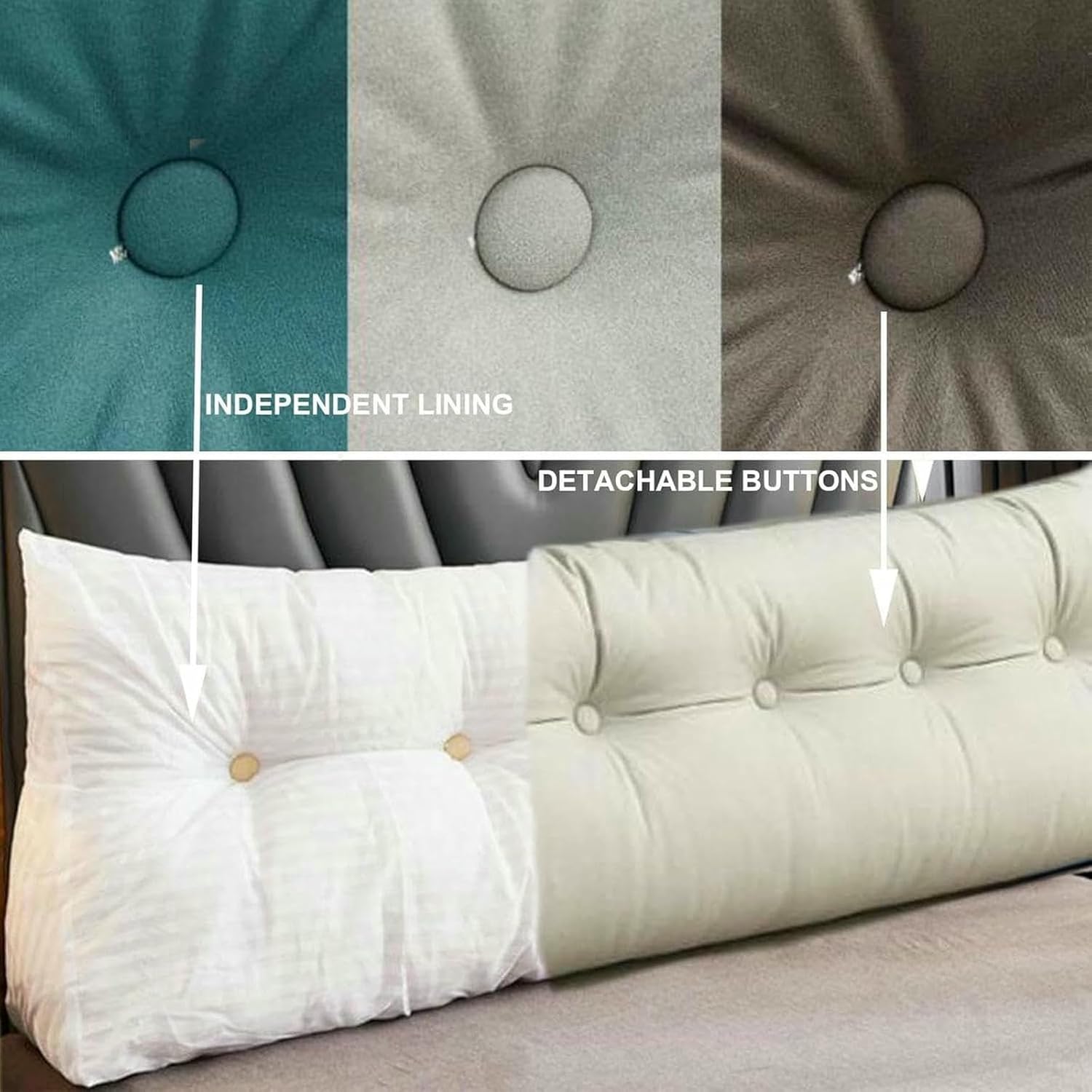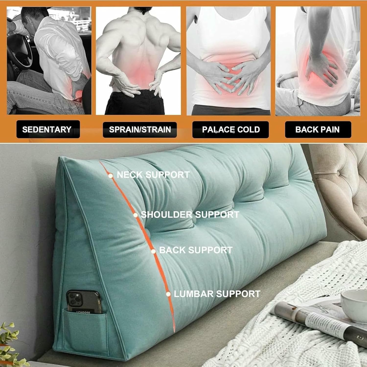The triangular wedge support backrest can relieve the pressure on your back and shoulders,and provide proper support for your waist and neck when you read and rest. The wedge slope of the pillow raises your head, relieves the pressure on the neck,back,and waist,and makes your sleep more comfortable.Product name: triangular headboard pillowMaterial: technical cloth fabricFilling: pearl cottonVarieties: leg pillows,lumbar support cushions,daybed pillows,resting reading pillow,headboard pillows.Thickness: medium to softDimensions (L x D x H): Small Size: 23.6x19x7.8"/60x50x20cm Single Size: 31.5x19x7.8"/80x50x20cm Twin Size: 39.3x19x7.8"/100x50x20cm Full Size: 47.2x19x7.8"/120x50x20cm Queen Size: 59x19x7.8"/150x50x20cm California King Size: 70.8x19x7.8"/180x50x20cm King Size: 78.7x19x7.8"/200x50x20cm Package Included:1 x headboard pillow (removable)Notes:1. We vacuum pack the pillow and ship it tightly, so please be careful not to cut the pillow itself when opening the package. As the backrest is compressed during shipping, please remove the vacuum bag and shake vigorously for 5 minutes to allow the pillow to return to its original loft and allow 48 hours to dry.2. If you are interested in the product, you can contact me at any time, and I will reply to your questions about the product as soon as possible within 24 hours.