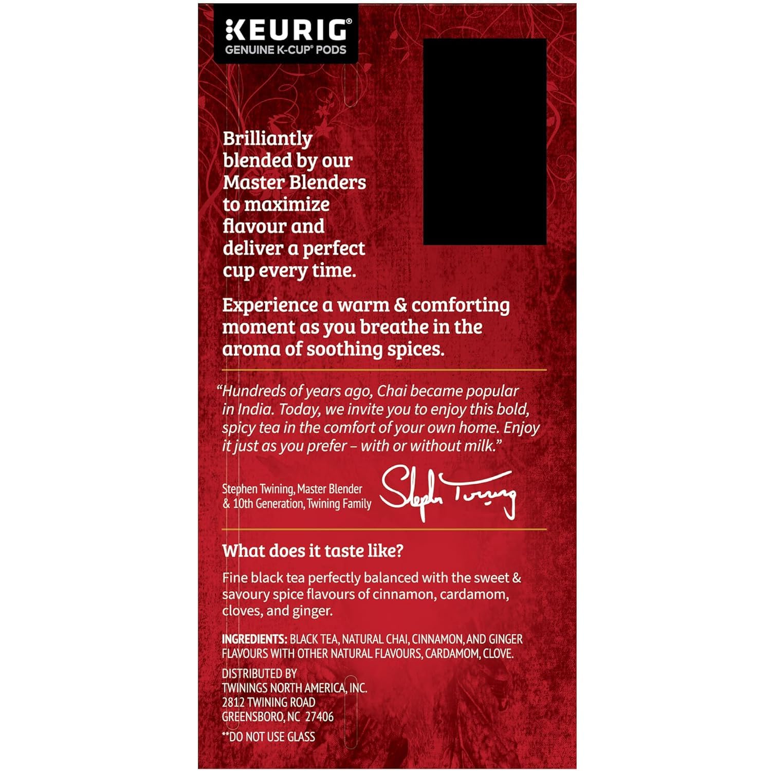 Twinings blends to perfection the finest black teas with the sweet and savoury spice flavours of cinnamon, cardamom, cloves and ginger to give you a line of great tasting Chai teas with a bold, spicy taste and rich, vibrant aroma. The finest black tea expertly blended with the sweet and the savoury spice flavours of cinnamon, cardamom, cloves and ginger to deliver a flavourful tea with a warm, soothing aroma and fresh, spicy taste.