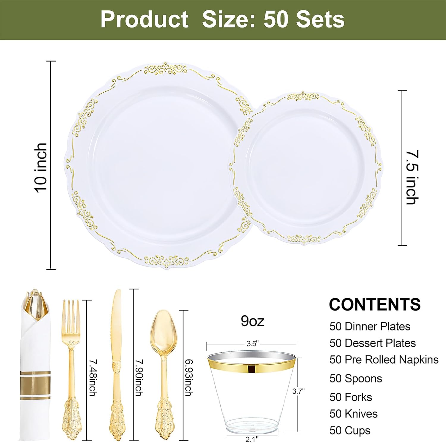 | Included Components | Cups, Dessert Plates, Dinner Plates, Rolled Napkins with Gold Cutlery |