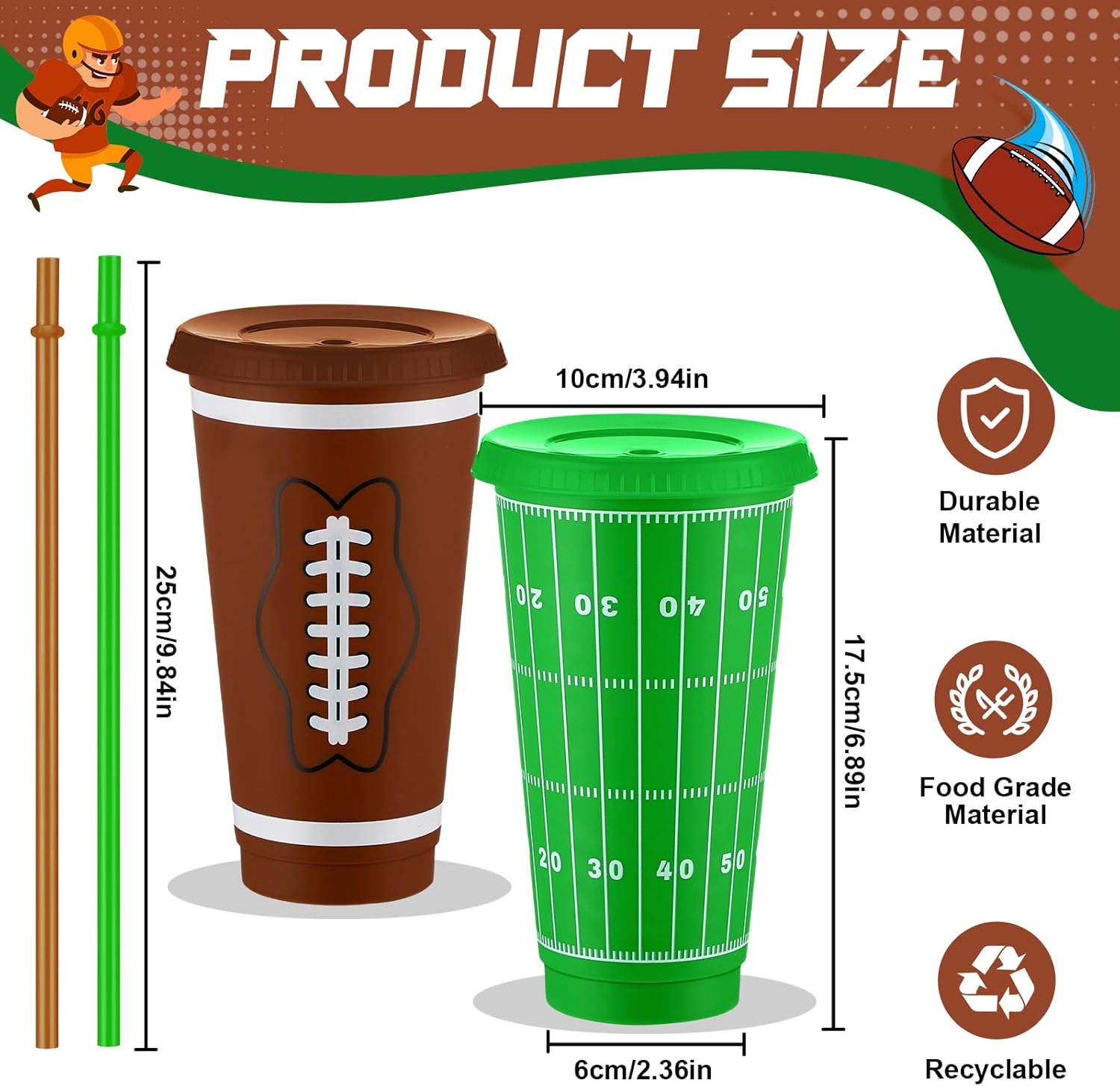 Features: These 24 oz plastic cups with lids make a good gift for friends and family who like football. They are practical and useful, which means that your loved ones will be able to use them on multiple occasions. These plastic cups football can add a delicate and elegant sense to your parties. Additionally, they have a smooth surface that feels comfortable in your hand and adds a touch of elegance to your party decorations. The football themed patterns on the cups will impress your guests and add a festive atmosphere to your party decorations. Specifications: Material: plasticColor: green, brownSize: approx. 24 ozPackage includes: 24 x Football cups with lids and strawsNotes: Manual measurement, please allow slight errors on size. The color may exist a slight difference due to different screen displays.