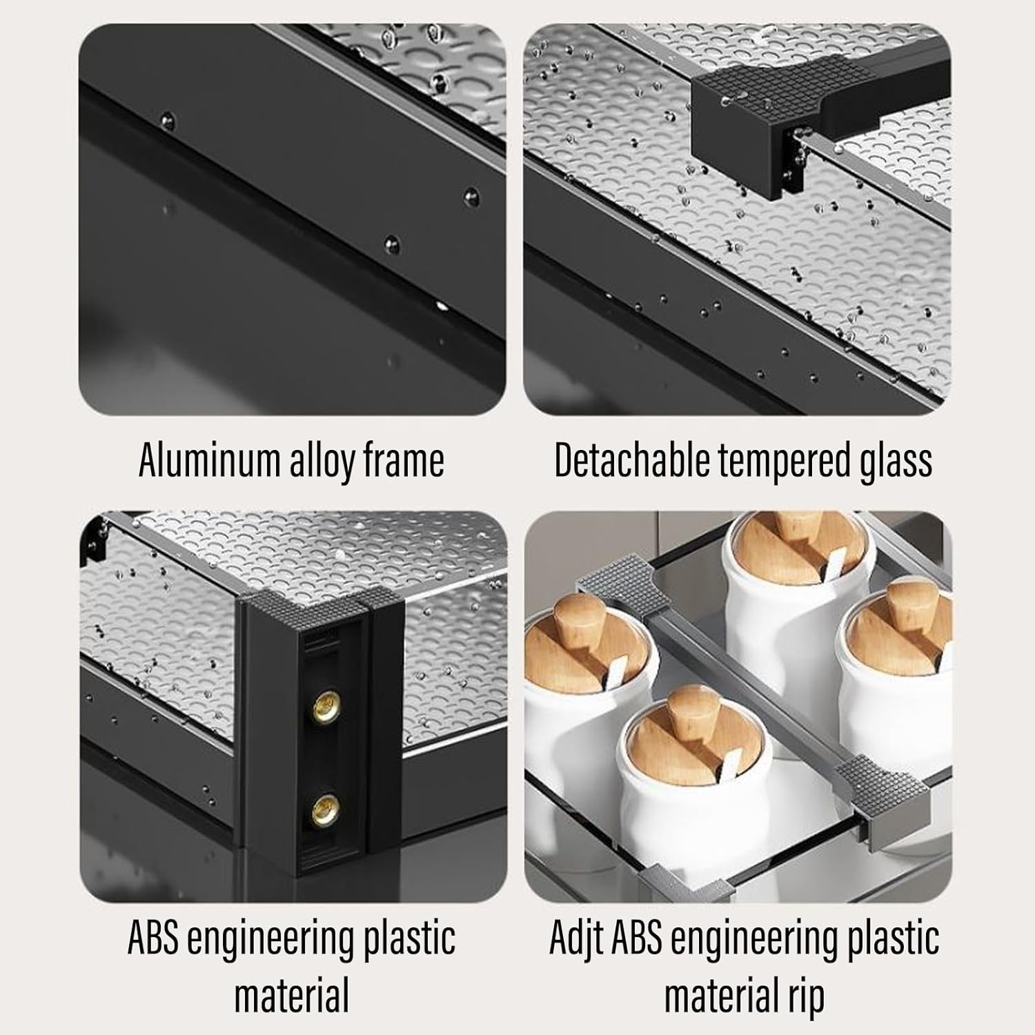 Introducing our premium aluminum alloy storage solution designed to enhance organization in any space. With a sleek design and sturdy construction, this storage unit features recessed stability and textured stainless steel shelves, ensuring a slip-resistant and spacious setup. The versatile flat-lay arrangement offers you flexible storage options tailored to your needs. The tempered glass panels provide excellent visibility, making it easy to find exactly what you're looking for, while the dampened bottom-mounted track ensures smooth and quiet sliding. This cabinet organizer is ready to use straight out of the box, making it an ideal addition to your kitchen, under-the-sink area, or as a countertop organizer. Available in various sizes (10cm to 39cm widths) and colors (Black, Gray, White), it fits seamlessly into any room. Perfect for: - **Kitchen Gaps**: Store frequently used seasoning bottles within easy reach while cooking, eliminating the hassle of bending down to search through cabinets. - **Study Areas**: Keep notebooks, pens, and chargers organized, reducing clutter on your desk and creating a tidy workspace. - **Laundry Rooms**: Store laundry beads, drying racks, and cleaning cloths right next to your washing machine for effortless access. - **Bathrooms**: Utilize the upper layer for toiletries to prevent clutter on the sink edge, while the middle layer is perfect for towels and bath essentials, promoting ventilation. Transform your living spaces with this stylish and functional storage solution that adapts to your needs. Make organization easy and efficient today!