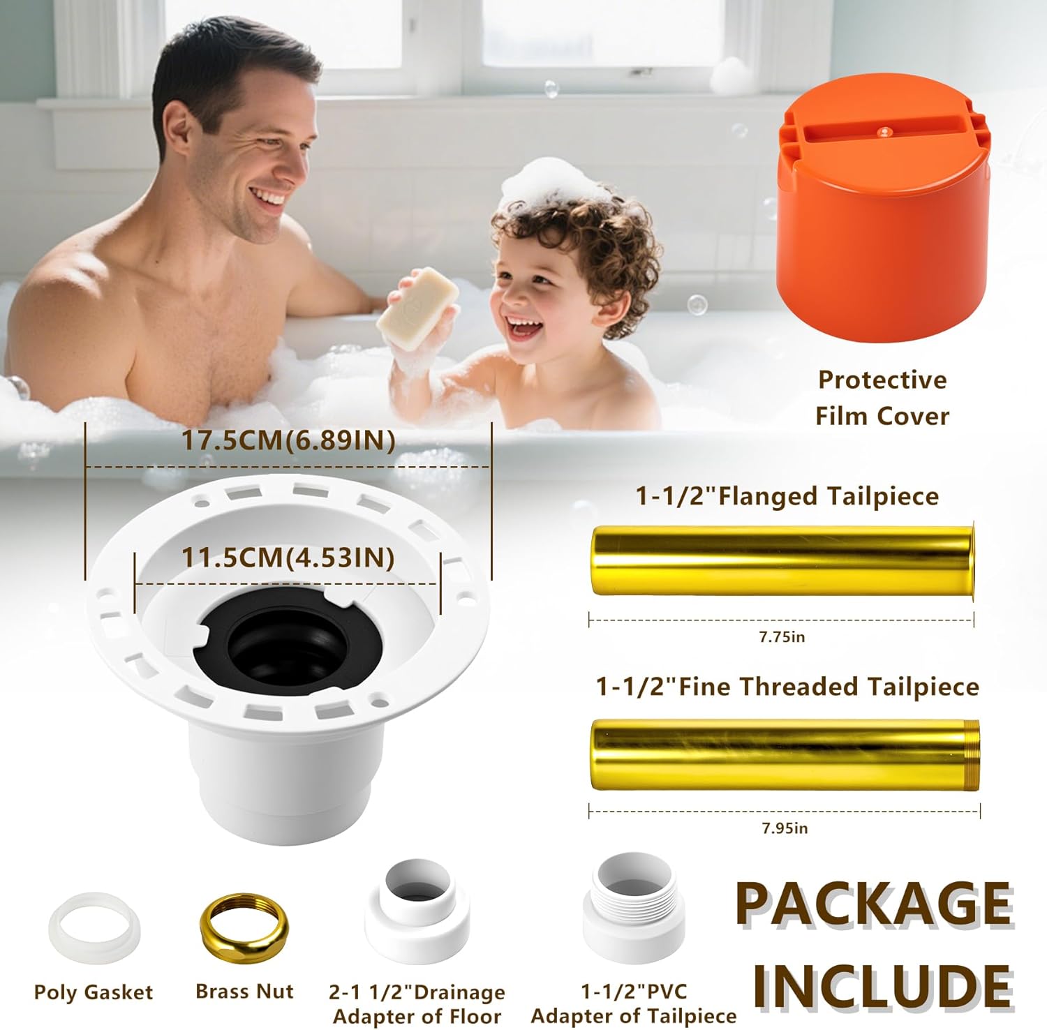 | Included Components | 1-1/2in.flanged brass tailpiece;1-1/2in.threaded brass tailpiece;1-1/2in.PVC Sch.40 threaded tailpiece adapter;1-1/2in.x2 in.PVC Sch.40 adapter, Cutout template;Lubricant, Freestanding tub drain body;Quarter-turn test plug, Protective cap;Slip joint nut;Slip joint washer |