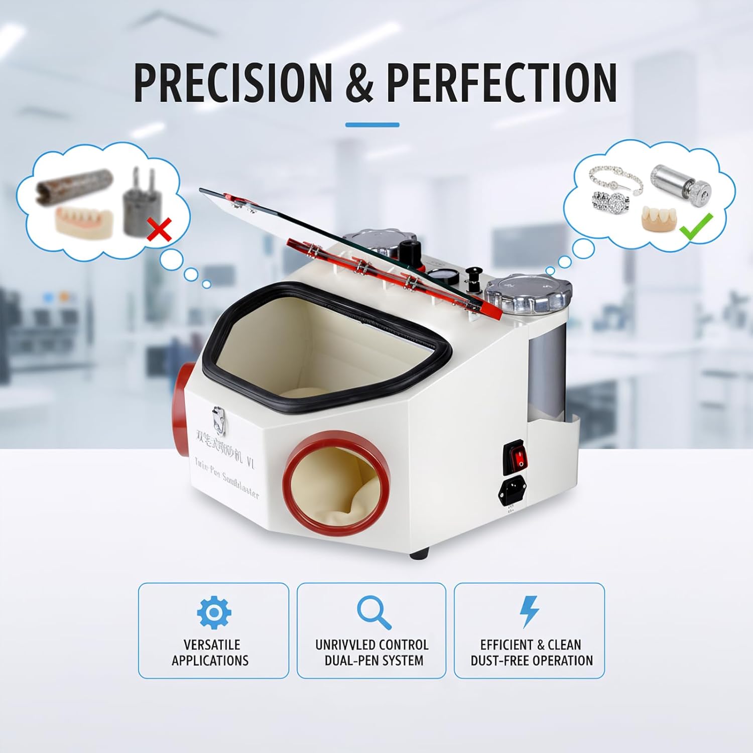 Specifications: Voltage: 110V/220V/50HZ Power: 10W Pressure: ≥4kg Sand size: ≥120 mesh Packing size: 47*44*32cm 14.5kg Product size: 38*41.5*29cm 10.95kg (including pedal, air pipe, etc.) Material: All-metal body
