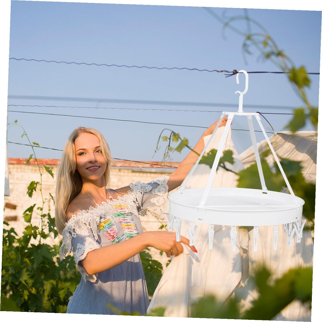 Package List 1 18 x clips 4 x hanging lanyards Features -Size: 50.00X50.00X40.00cm/19.65X19.65X15.72 in. -Material: PP -Product Info:Drying rack -Color: White - The clips of the hanger are perfectly spaced to efficiently maximize air flow bras drying hanger. - The lightweight design is perfect for camping, outdoor, business trip, travel or vacation socks drying rack. - Great handy item to organize your closet, the possibilities are endless! underwear drying hanger - Suitable to hold and dry socks, bras, cloth diapers, towel, underwear, scarf or other small delicate items clothes drying hook. - You won't face short of hangers and take less space by using this hanger socks drying hanger.Goods Descriptionunderwear drying rack Multi-functional hanger can be used in various occasions, such as small clothes, clothes, underwear, masks, bras, shorts, handkerchiefs, towels, gloves, socks, scarves, hats, ties, cloth diapers, etc.clothes drying is easy to hanging on laundry room, wardrobe, closet, shower curtain rod, outdoor clothesline, etc
