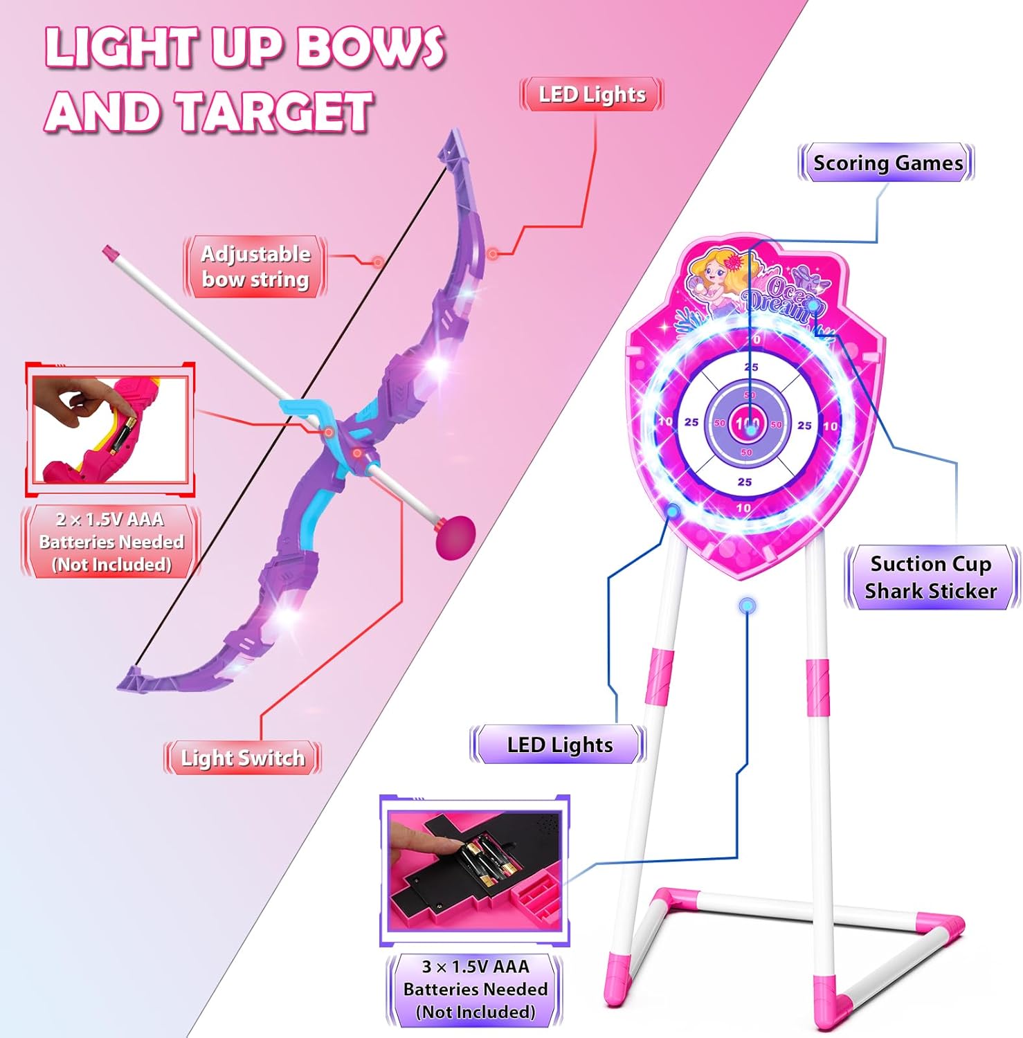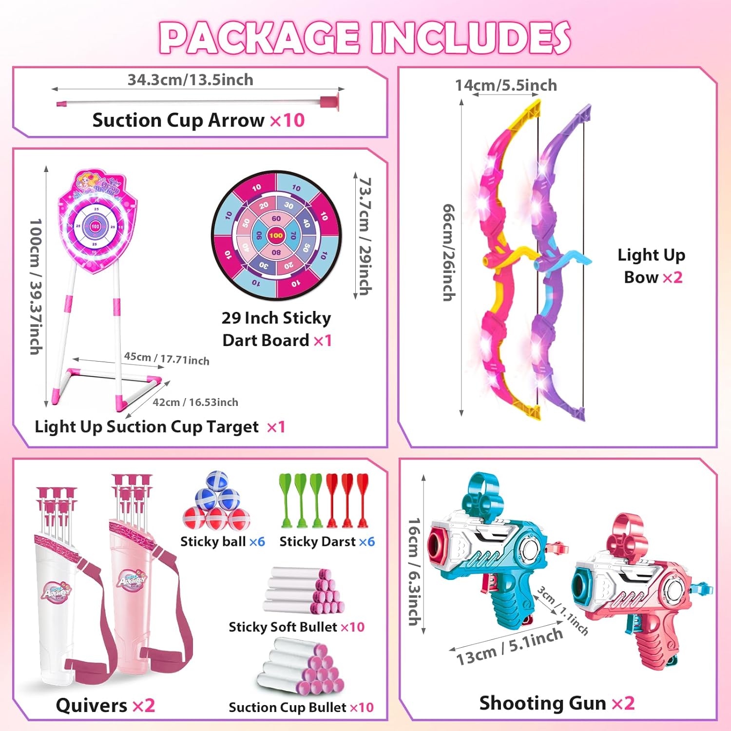 | Included Components | Arrow * 20, Quiver * 2, Light Up Bow * 2, Shooting Gun * 2, Light Up Mermaid Target * 1, 29 Inch Dartboad * 1, Soft Bullet (10 * suction & 10 * sticky), Sticky Dart * 6, Sticky Ball * 6 |