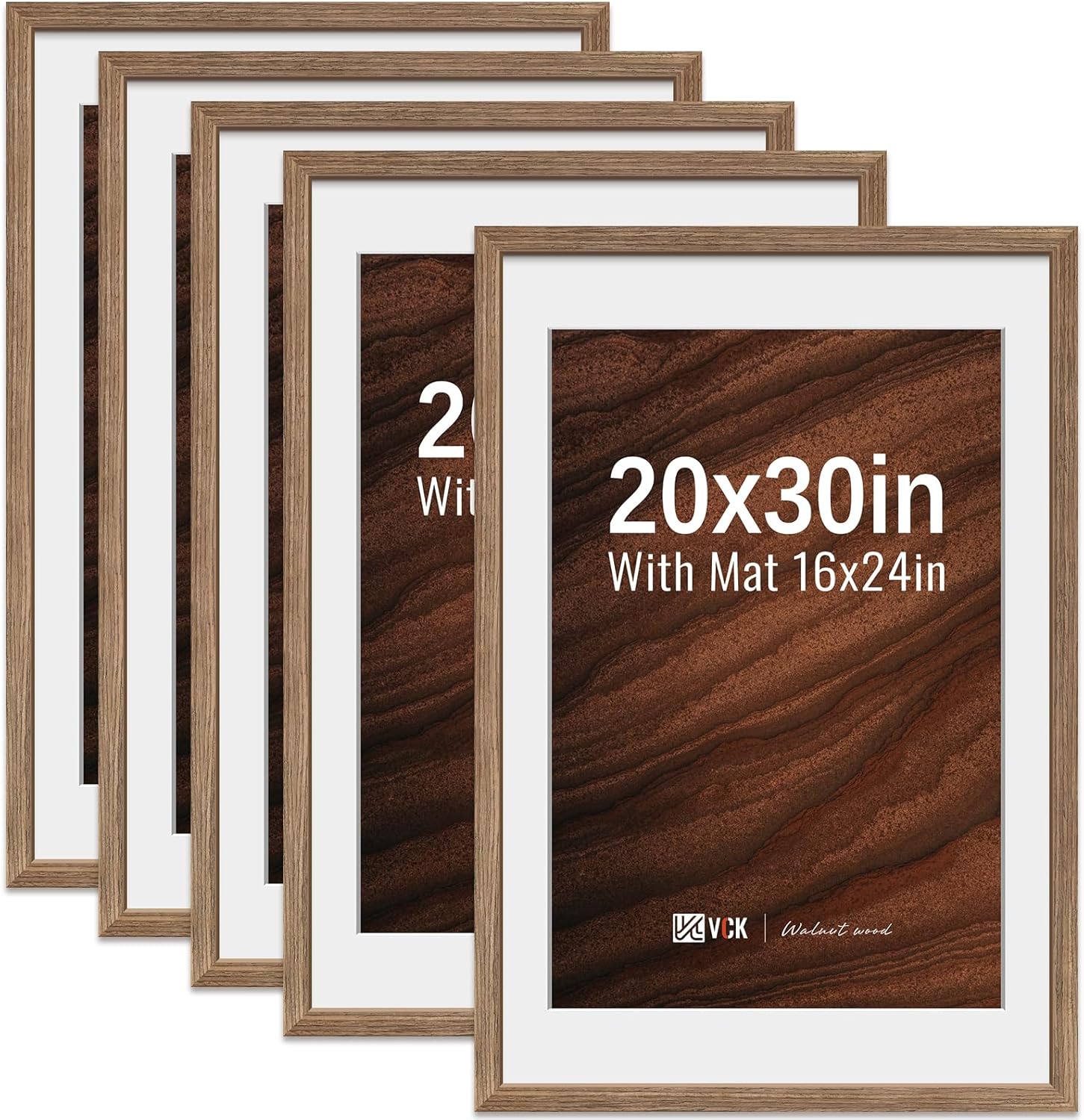 VCK 8x10 Picture Frame 5 Pack - Brown, High-End Wood Poster Frames with Tempered Glass, Display 5x7 Photo with Mat or 8x10 without Mat, Art Gallery-Quality, Wall Hanging/Tabletop, Brown