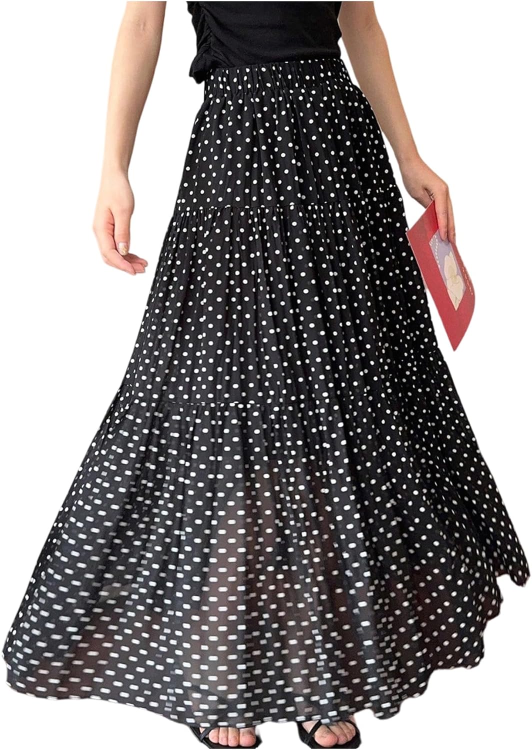 Verdusa Women's Polka Dots Ruffle Maxi Skirt Elastic High Waisted A Line Flowy Long Skirts
