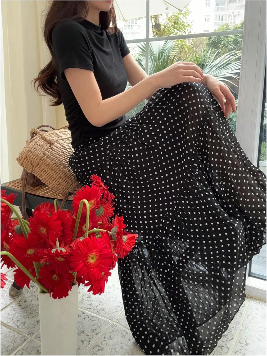 • Vacation skirts, going out bottoms, spring fall clothes for women, polka dots, ruffle hem, elastic waist, high waist, a line, loose fit, maxi length, casual style