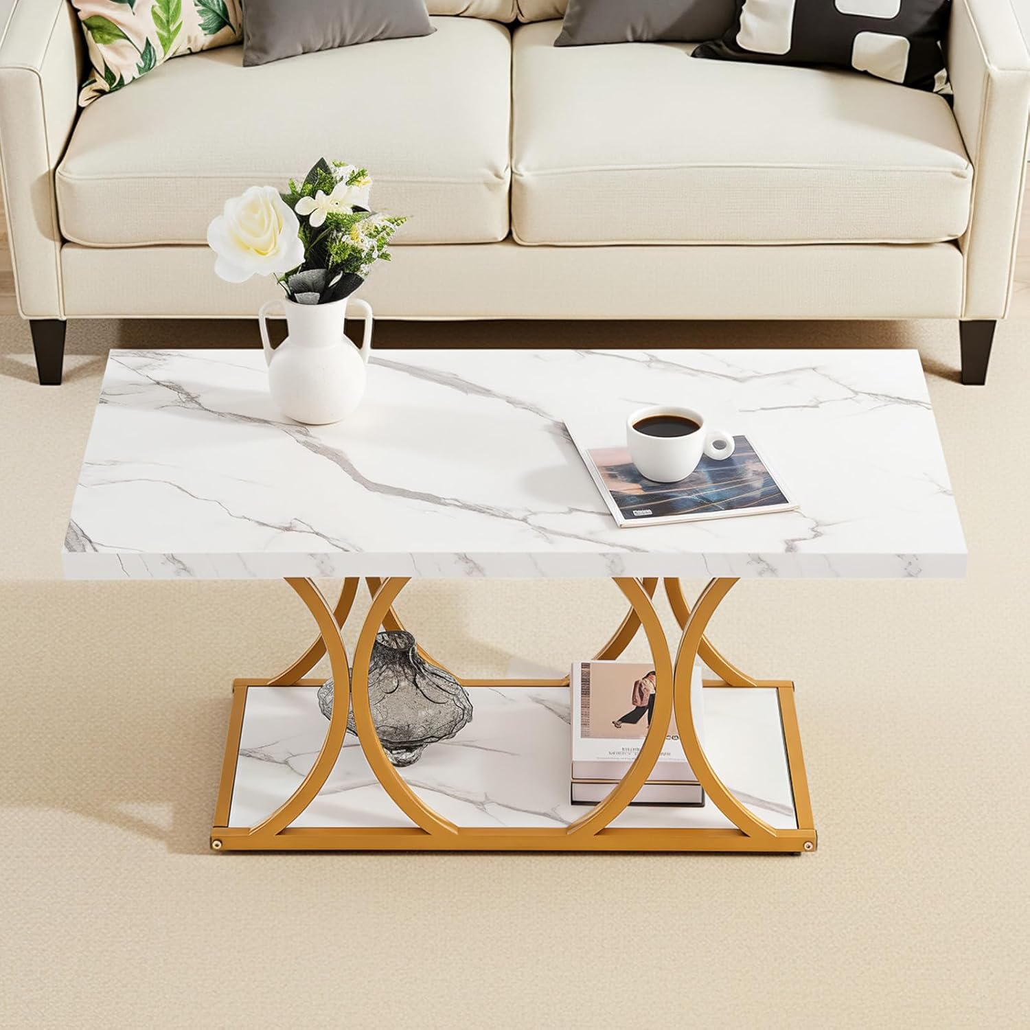 | Item Type Name | Modern Faux Marble Coffee Table, Large 2-Tier Rectangle Center Desk with Geometric Legs, Minimalist Sturdy Metal Frame Accent End Desk for Living Room, Office, Easy Assembly, White |