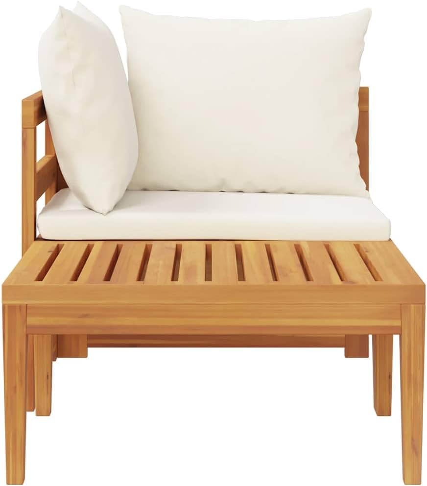 Enjoy a cosy leisure time with your friends or family in the outdoor space with this wooden patio lounge set!This outdoor lounge set is made of solid acacia wood, a hardwood with dense grains. This beautifully-designed garden lounge set is stable, durable and eye-catching. Additionally, the exquisite craftsmanship and beautiful wood grains make every piece slightly different from the next. In addition, the included cushions add more comfort while resting. The sturdy tabletop is ideal for placing drink and food.Note: In order to extend the life of your outdoor furniture, we recommend you to clean it regularly and do not leave it outdoors without protection unnecessarily.Clean: Use a mild soap solution.Storing: If possible, store in a cool, dry place indoors. If the product is stored outdoors, protect it with a waterproof cover. Wipe and dry the excess water or snow from flat surfaces after a rain or snowfall. Allow sufficient air circulation to avoid moisture-related damage.Cushion color: Cream whiteMaterial: Solid acacia wood with oil finish, fabric (100% polyester)Corner sofa dimensions: 26" x 26" x 23.6" (L x W x H)Table dimensions: 25.2" x 25.2" x 11.4" (L x W x H)Seat height from the ground: 11.4"Cushion thickness: 2.4"Pillow thickness: 4.7"Assembly required: YesDelivery contains:1 x Corner sofa1 x Seat cushion2 x Back pillow1 x Table