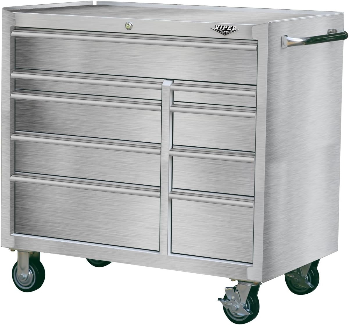 This 41-Inch 9-drawer rolling cabinet by Viper Tool Storage provides plenty of room to organize tools of different sizes and trades. • each drawer is equipped with 100 pound load rated slides, with double slides in the top drawer and 2 bottom drawers, increasing their capacity to up to 200 pounds each. Ball bearings provide an effortless Glide and the lever release feature allows for easy drawer removal. A locking latch and Hold-In detents help prevent accidental opening. Full length aluminum pulls have a generous grip, and pre-cut, non-adhesive, woven non-slip liners protect and cushion your items. • sturdy 304 Stainless Steel resists corrosion, helping to maintaining its attractive look for years to come. • a locking bar secures the slides internally with a 7-pin Cylinder Keyed barrel Lock, making it difficult to pry or pick • one side-mounted tubular handle and four rugged, chemical resistant 5 x 2-inch polyurethane casters (2 swivel with toe locks, 2 rigid) help protect the floor from marks and make this cabinet easy to move around your workspace. • 19, 363 Cubic inches storage capacity. Overall dimensions (inches) w 45 x D 24.62 x H 40.87. Drawer dimensions (inches, w x D x H) 37.37 x 21 x 5.25; 23.25 x 21 x 2.12; 23.25 x 21 x 5.25; 23.25 x 21 x 5.25; 23.25 x 21 x 8.12; 11.75 x 21 x 2.12; 11.75 x 21 x 5.25; 11.75 x 21 x 5.25; 11.75 x 21 x 8.12 • backed by the manufacturer with a lifetime warranty against defects.