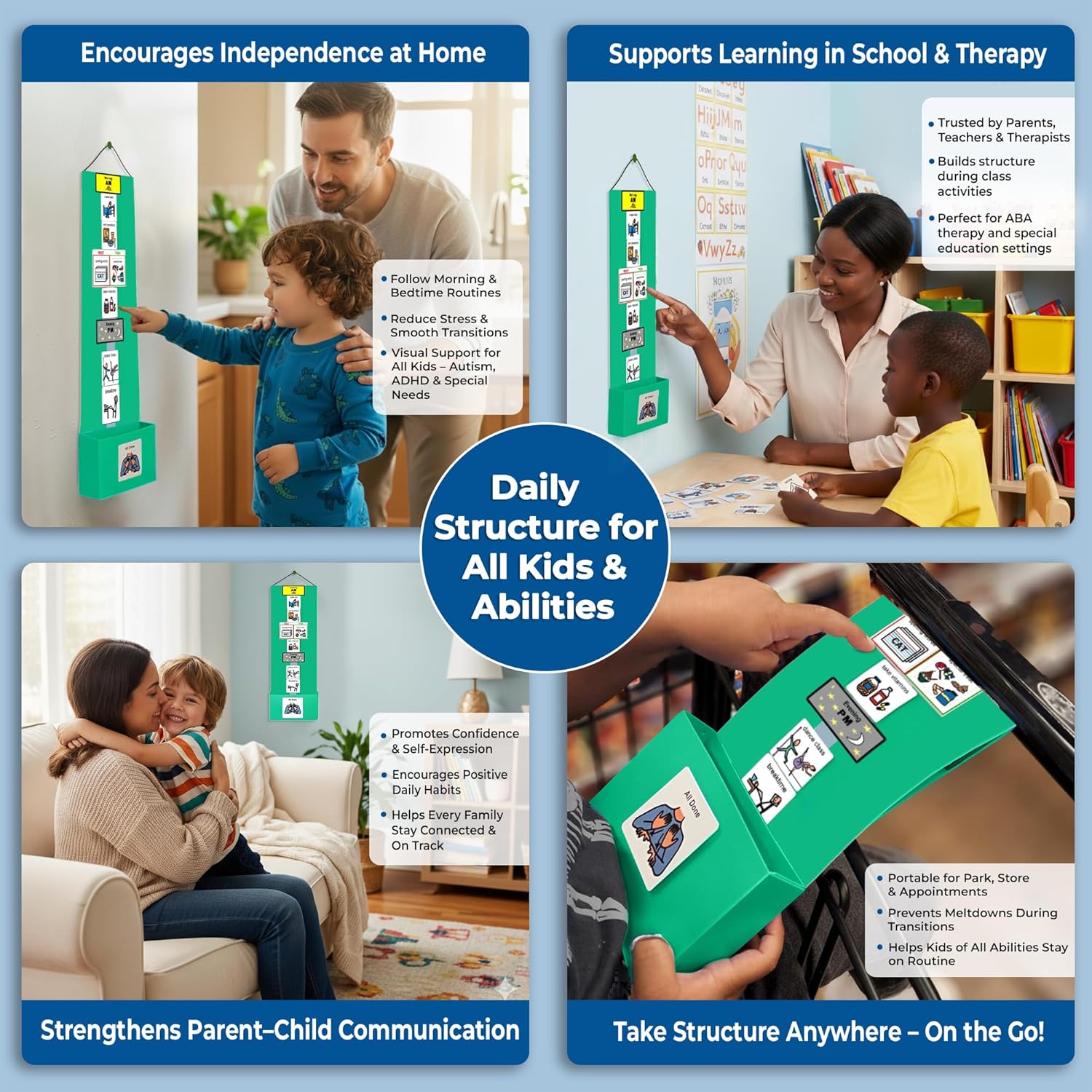 ✨ A Visual Schedule That Works for Every Child – Whether your child has Autism, ADHD, speech delays, or simply thrives on structure, this visual routine chart helps kids stay on track, reduce anxiety, and transition smoothly between activities. Parents love it for toddlers and preschoolers learning routines, while teachers and therapists rely on it as a trusted support tool for children with special needs. ⭐ Create Structure & Reduce Anxiety – Helps establish predictable routines and reduce anxiety during transitions.👨👩👦 Encourages Independence, Motivation & Responsibility – With a removable “All Done” pocket and First-Then card system, children gain pride and confidence while building self-esteem and independence.📚 Complete Visual Schedule with 133 Cards – Includes 120 picture cards covering chores, self-care, school, places-to-go, and rewards, plus 8 heading cards and 5 blank cards.🏆 Durable Plastic & Ready-to-Use – 1.5" x 1.5" pre-cut plastic cards with rounded corners and pre-applied soft loop coins. Bite-proof, tear-proof, and waterproof for long-lasting use.💖 Perfect for Special Education & Nonverbal Communication – Helps nonverbal kids express needs and follow routines. Suitable for toddlers, children, and teens with Autism, ADHD, and special needs.