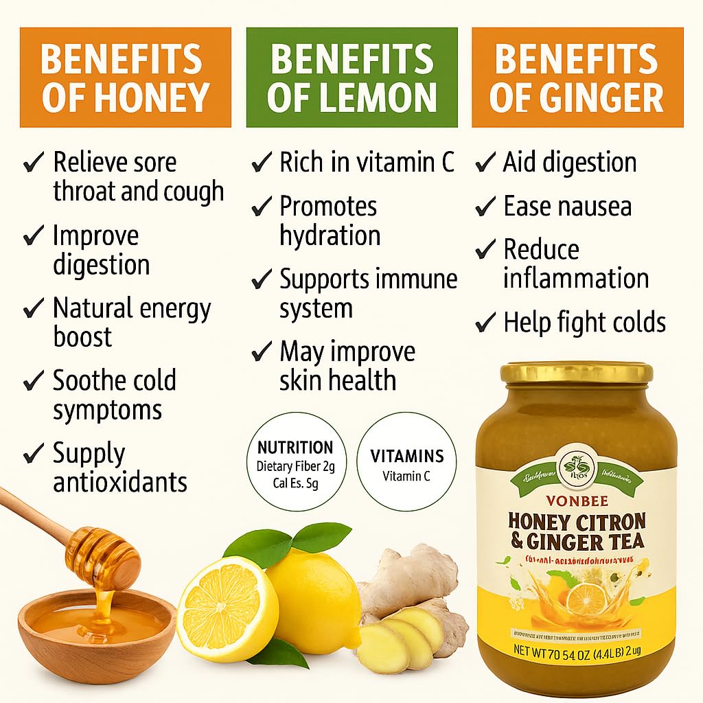Experience authentic Korean honey citron ginger tea with this premium 2-pack blend. Each 4.4 lb jar contains traditional yuzu-style citrus marmalade, pure honey, and warming ginger - perfect for instant hot tea, refreshing iced beverages, or sparkling citrus drinks. Versatile Kitchen Essential: Beyond tea, this natural citrus preserve enhances breakfast spreads, pancake toppings, yogurt parfaits, and gourmet marinades. The sweet-tangy flavor with ginger warmth creates café-quality drinks at home. Natural Wellness Benefits: Traditional Korean ingredients support digestive health and immune function. Ginger provides natural warming properties while citrus offers vitamin C and antioxidants for daily wellness. Premium Bulk Value: Two large jars provide 140 total servings, making this perfect for families, office kitchens, and food service applications. Store in cool, dry place for optimal freshness.