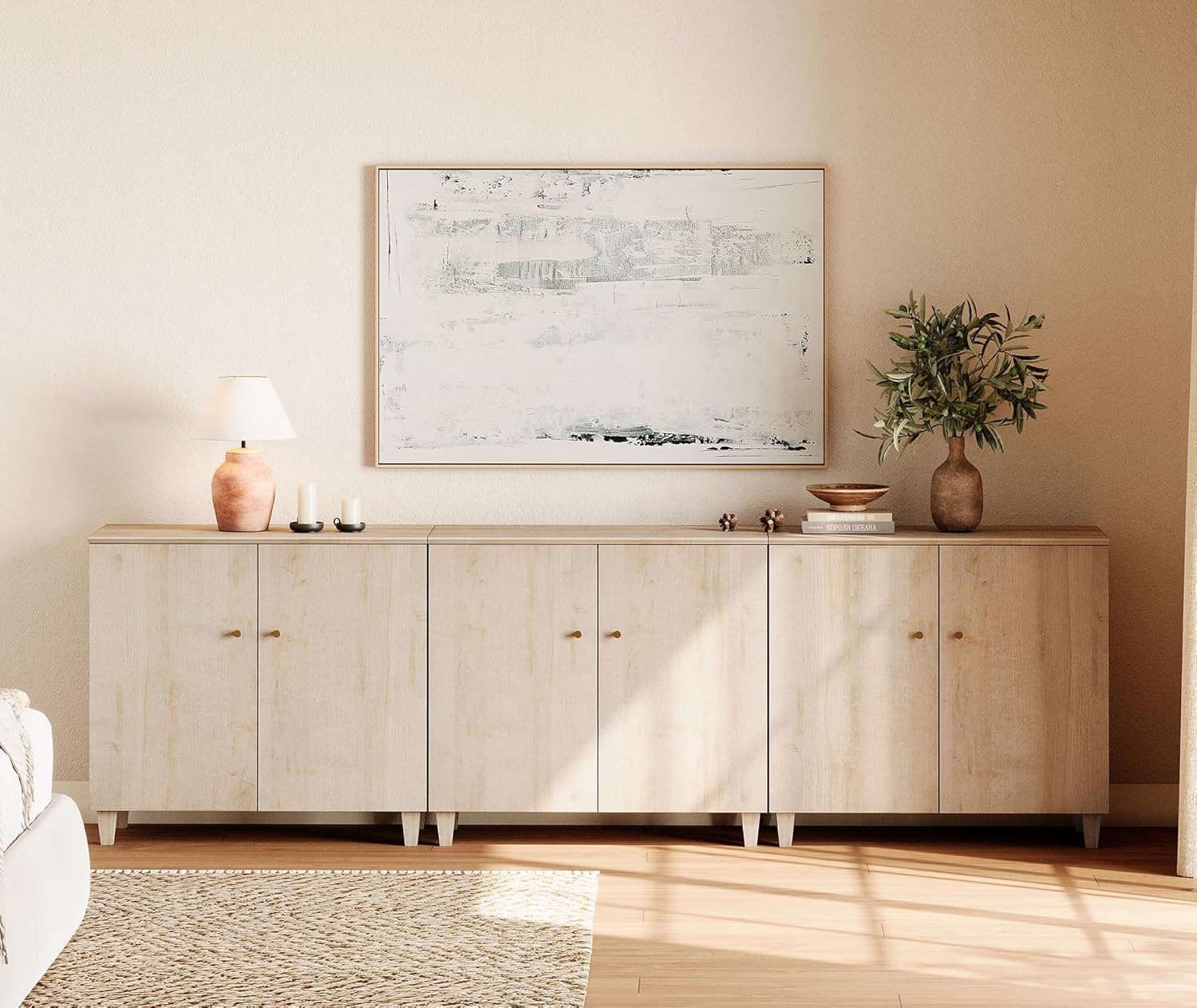 WAMPAT Long Dresser for Bedroom, 2-in-1 Natural Oak Wood Modern Dresser Chest for Closet Storage Organizer with 6 Compartments, Doors and Solid Legs for Kids Room, Baby Room, Nursery, 70.8" Wide