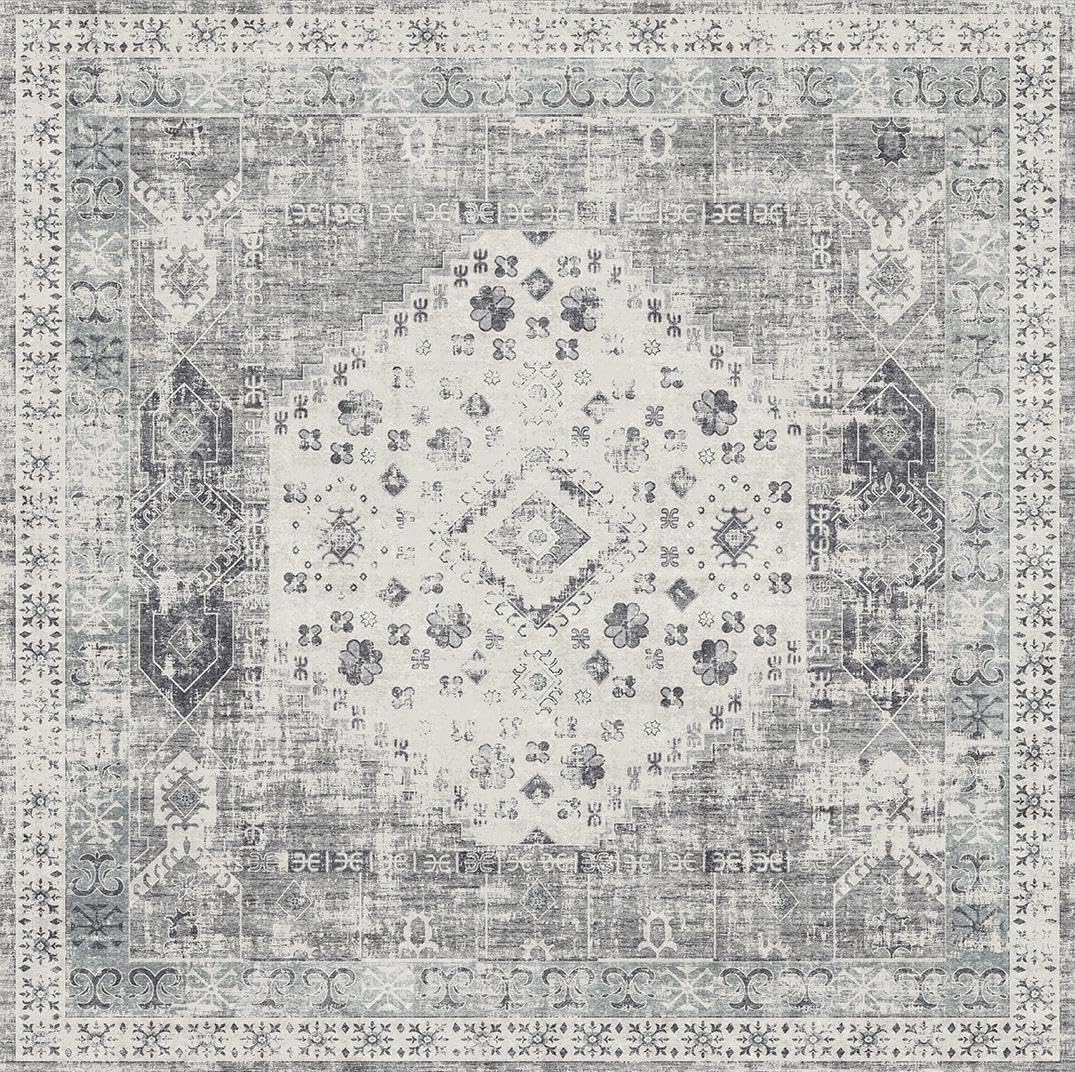 Washable 6ft Round Area Rug - Vintage Living Room Bedroom Rugs with Non Slip Backing Indoor Low Pile Carpet for Kitchen Nursery Ultra Soft Home Decor Floor Mat for Bathroom (Grey,6round)