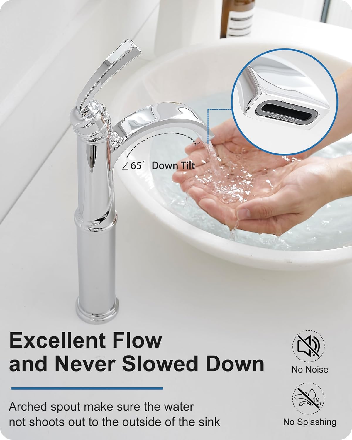Roman Tub Faucet Data: Material: A+ brass Water Volume: 3.25 Gpm Faucet height: 3.15 inch Handle height: 2.44 inch Spout reach: 5.11 inch Hose length: 23.6 inch Hose specifications:1/2″ NPT Female Install hole φ: 1.06-1.5 inch Hole distance: 5-16 inch Deck thickness: 0.1-1.8 inch Bathroom Sink Faucet Data: Flow Shape: Waterfall Materials: A+ Brass Water Volume: 1.56 Gpm Faucet height: 13.5 inch Spout reach: 4.84 inch Hose length: 29.5 inch Hose specifications: 3/8″ NPT Female Deck hole φ : 0.99-1.6 inch Deck thickness: 0.1-2.36 inch