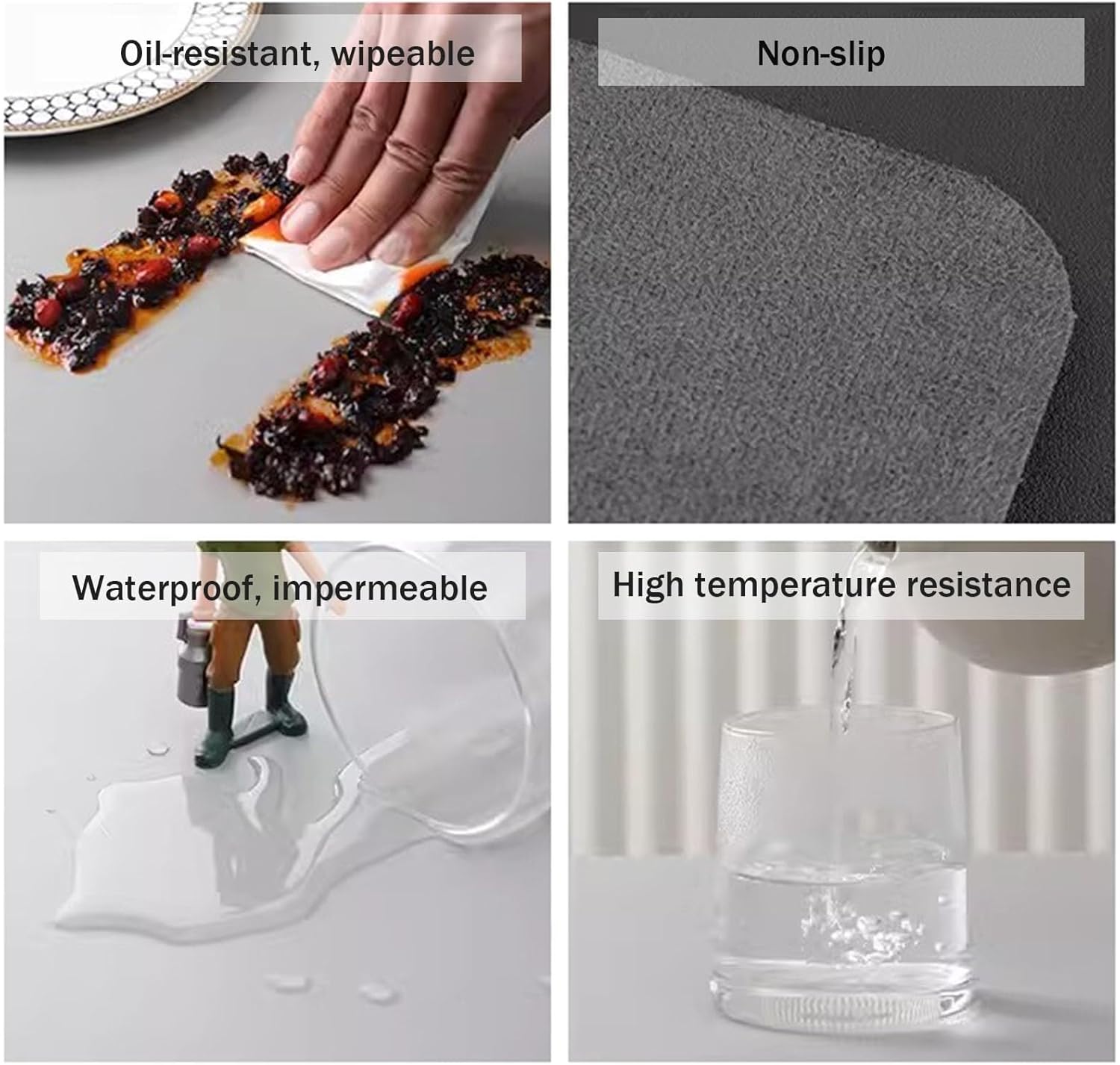 • 【WIPEABLE TABLECLOTH】: For daily use, wipe it with a damp cloth. All liquids including water, wine, soy sauce, chili oil (requires immediate erasure) etc. can be quickly wiped clean with a damp cloth or napkin. When the liquid splashes on the leather table mat, it forms droplets and slides off, easy to clean. wipeable leather table mat.
